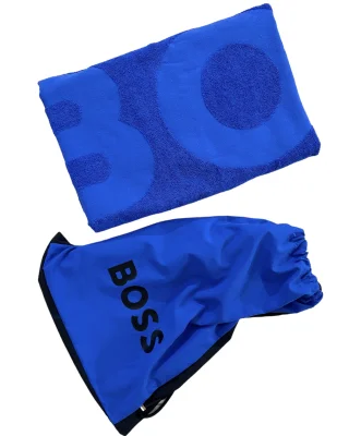 BOSS Strand-Set, das aus einem Baumwoll-Handtuch mit Branding, einer passenden Badeshorts aus einem schnell trocknenden Gewebe mit durchgehendem Innenfutter und einem Beutel mit Kordelzug besteht.