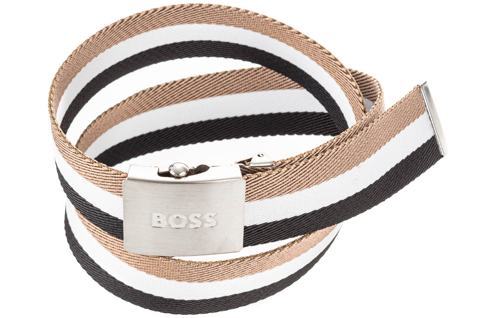 Charakteristischer BOSS Gürtel, der in Italien gefertigt wird. Das 3,5 Zentimeter breite Herren-Accessoire ist mit einer silberfarbenen Koppelschließe aus Metall versehen. Die BOSS Signature-Streifen am Riemen prägen das Design.