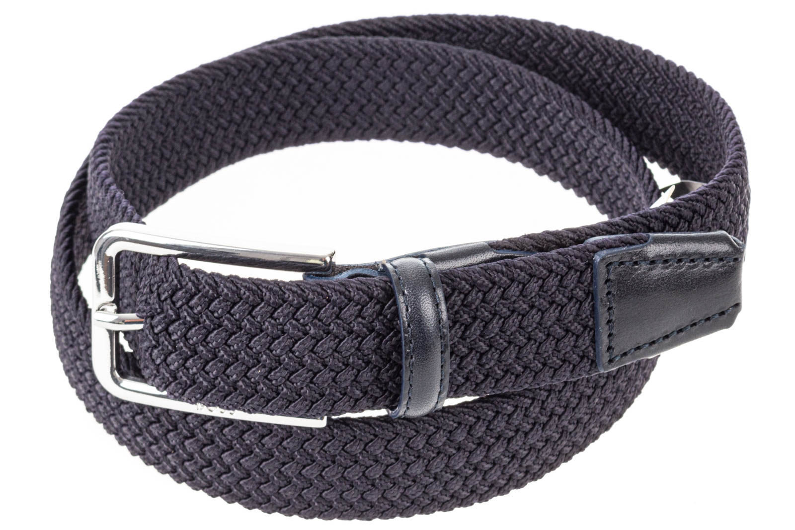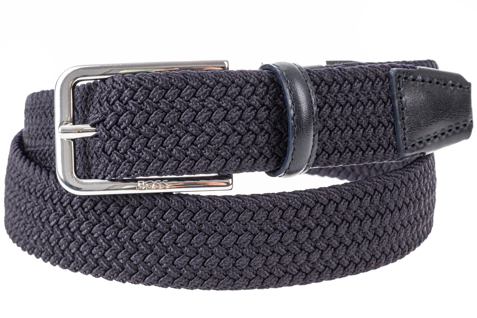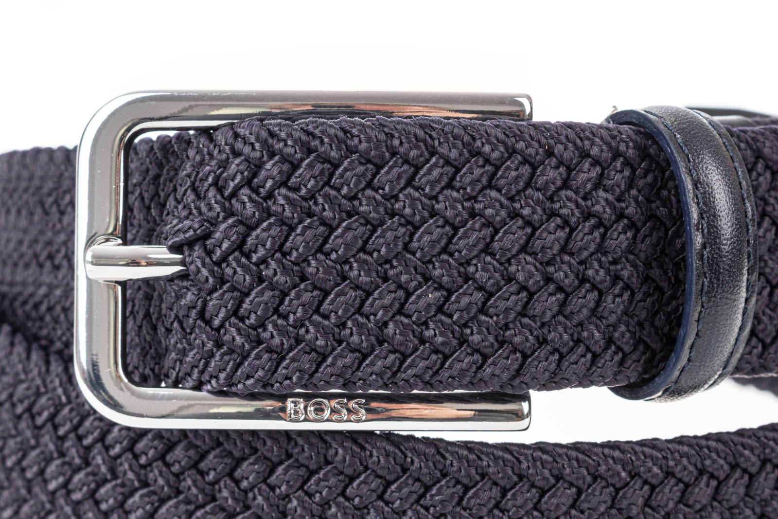 Eleganter BOSS Gürtel, der in Italien gefertigt wird. Das 3,0 Zentimeter breite Herren-Accessoire ist mit einer polierten, silberfarbenen Dornschließe versehen. Lederbesätze verleihen dem Style aus einem gewebten, elastischen Material-Mix einen edlen Touch.