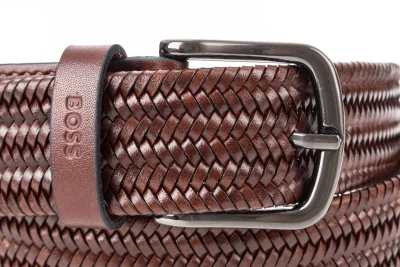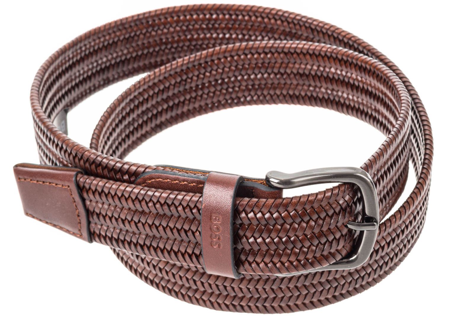 Edler BOSS Gürtel. Das 3,5 Zentimeter breite Herren-Accessoire mit einer Dornschließe aus gebürstetem Metall ist aus gewebtem Leder gefertigt und sorgt für einen legeren Look. In die Lederschlaufe ist ein BOSS Logo geprägt.