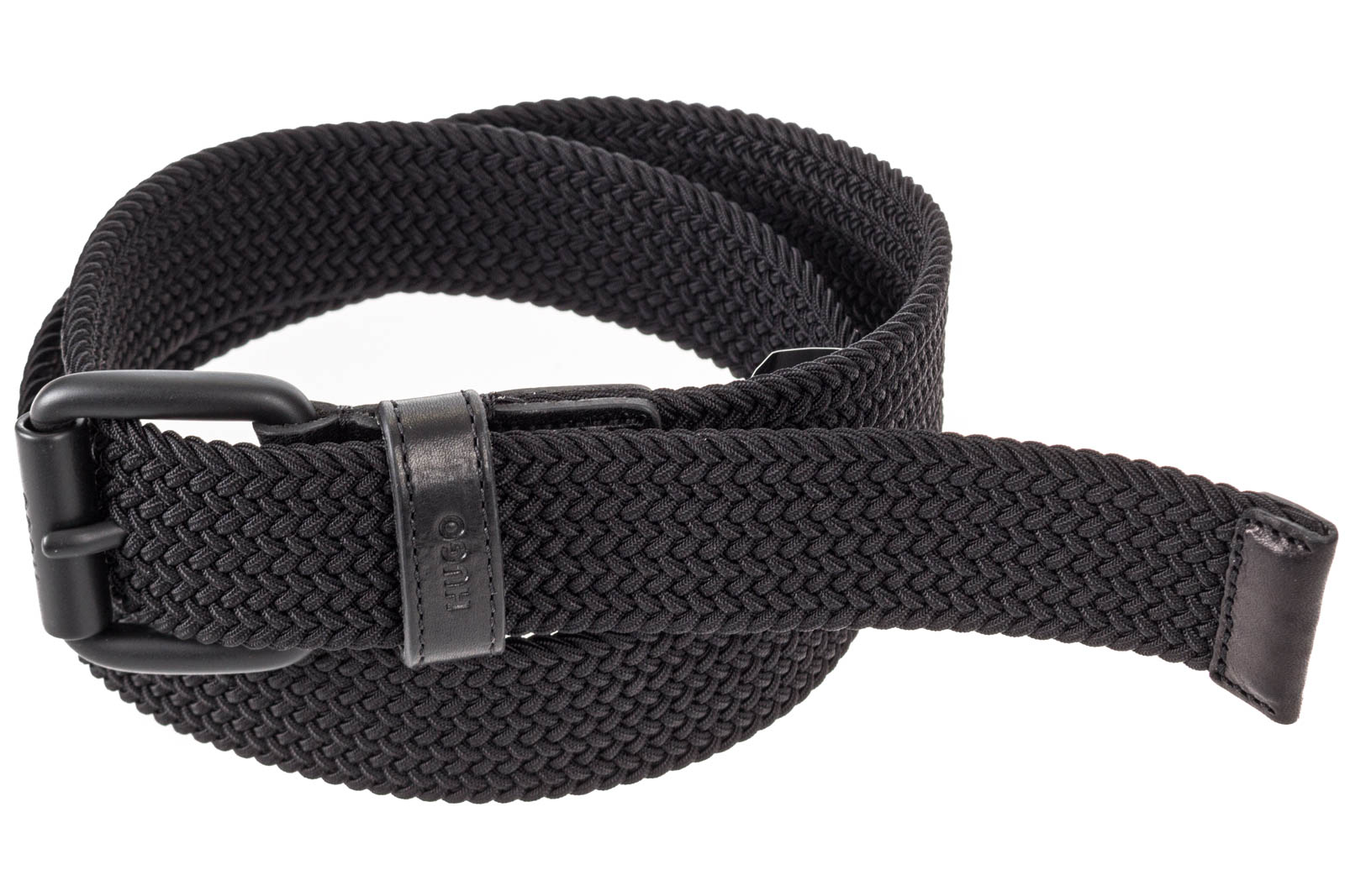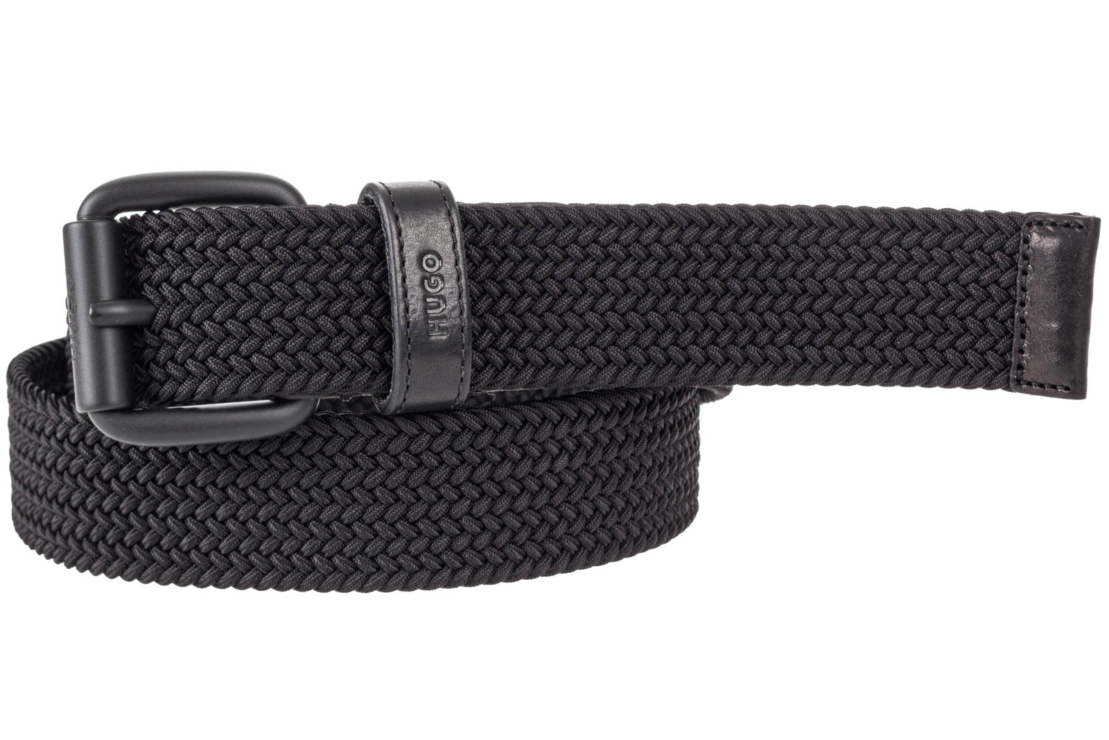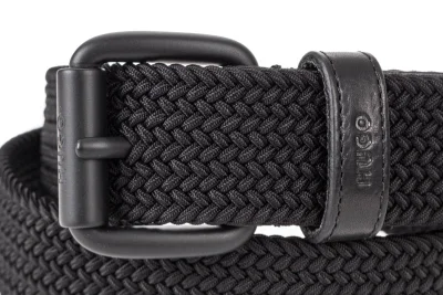 In Italien gefertigter HUGO Gürtel aus einem elastischen Material-Mix mit 3,5 Zentimetern Breite, Lederbesätzen und Logo auf der Schließe.