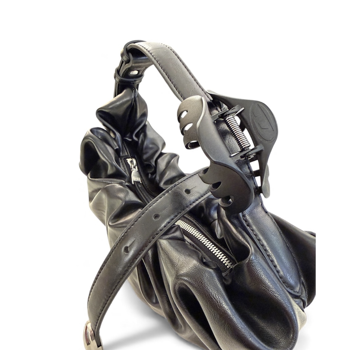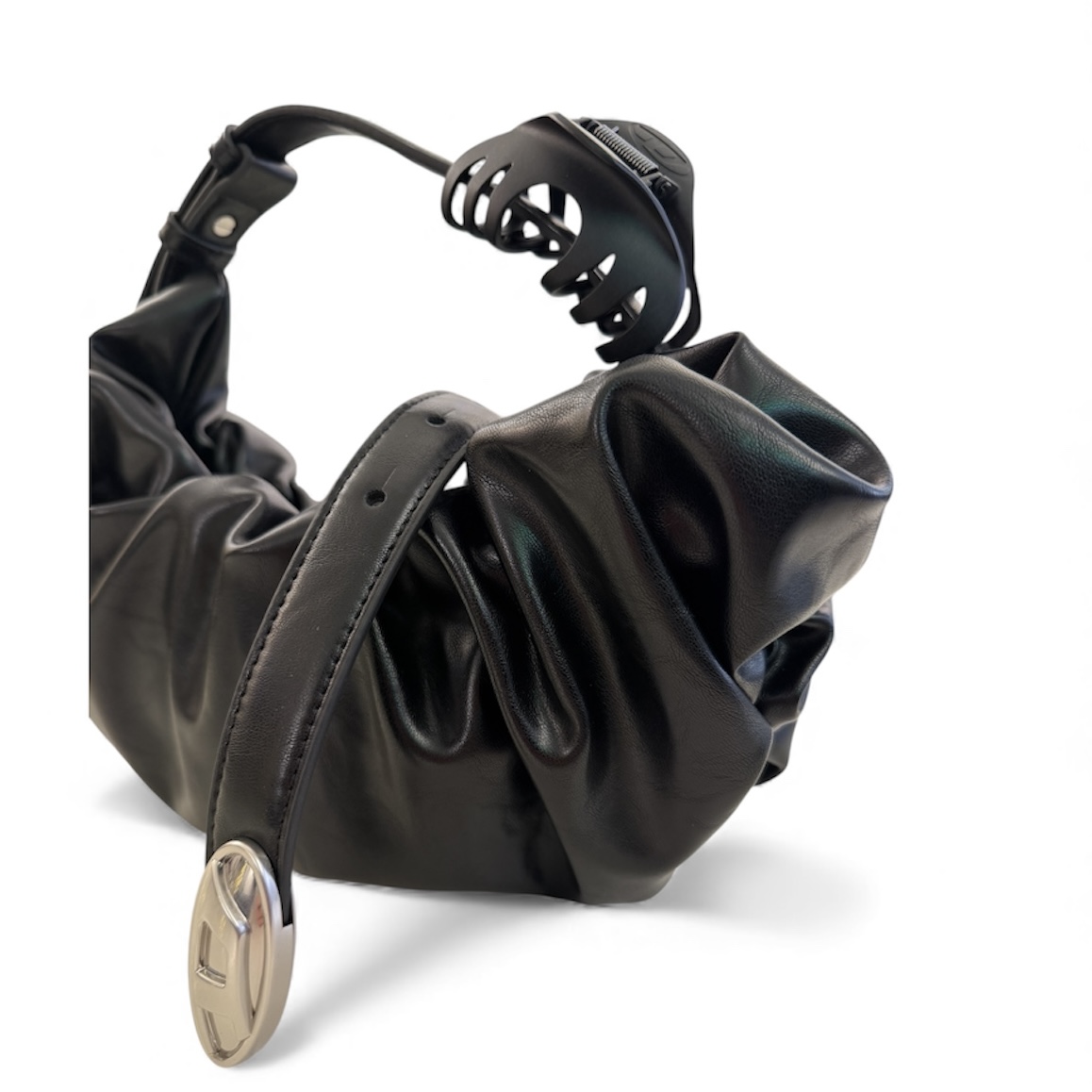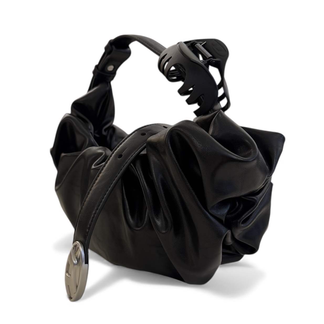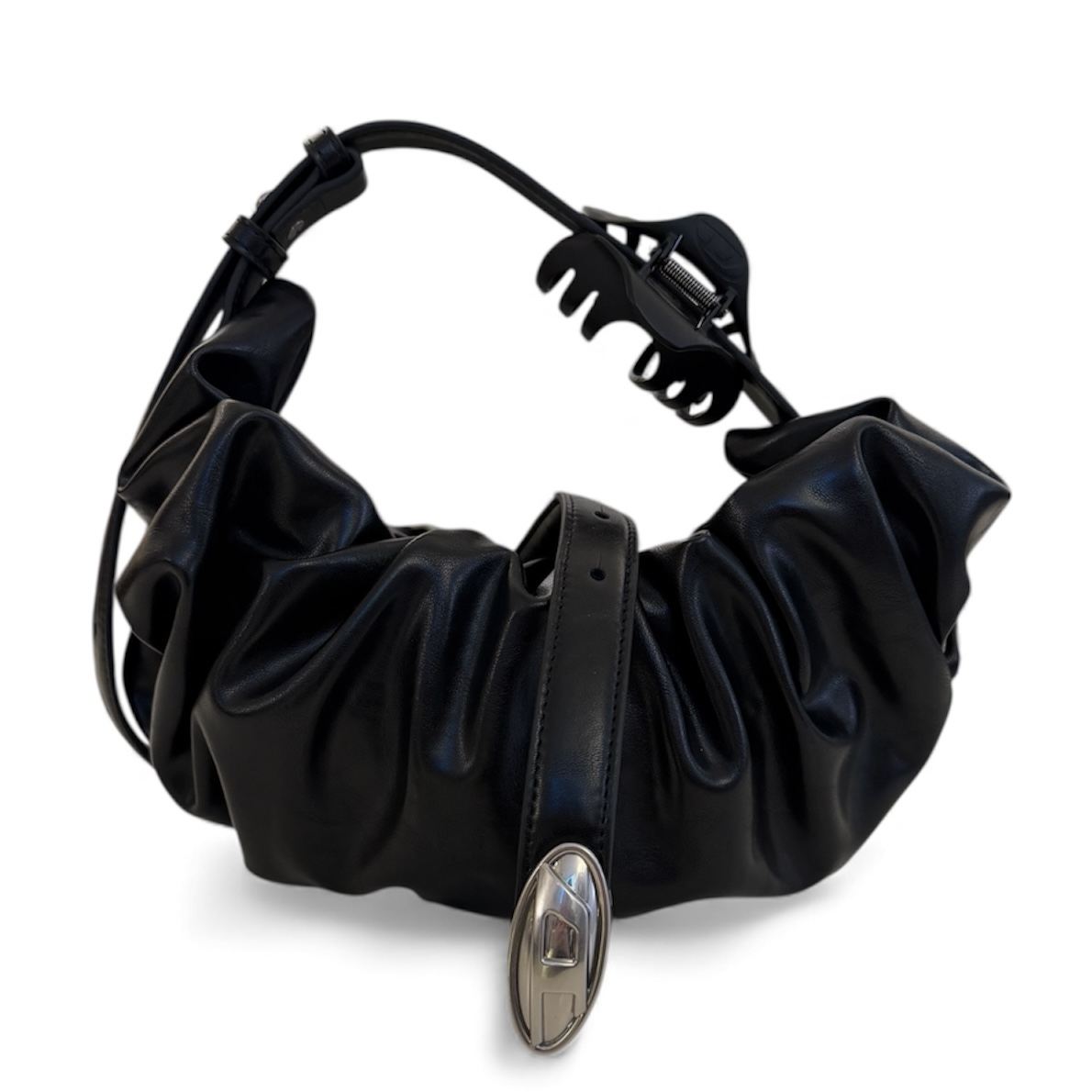 Ein exklusiver FW25-Runway-Show-Stil, diese kleine Handtasche für Damen zeichnet sich durch eine lässige Hobo-Silhouette aus, die entlang des Reißverschlusses für einen zerknitterten Effekt gerafft ist. Die Hobo Tasche ist besonders weich und glänzend und verfügt über einen innovativen, an einen Gürtel erinnernden Griff, der mit einer Haarspange versehen ist. Der Griff geht in einen baumelnden Riemen über, der das Oval D aus Harz an der Spitze zur Geltung bringt. Tragen Sie die Hobo Bag für Damen am oberen Griff oder über der Schulter.