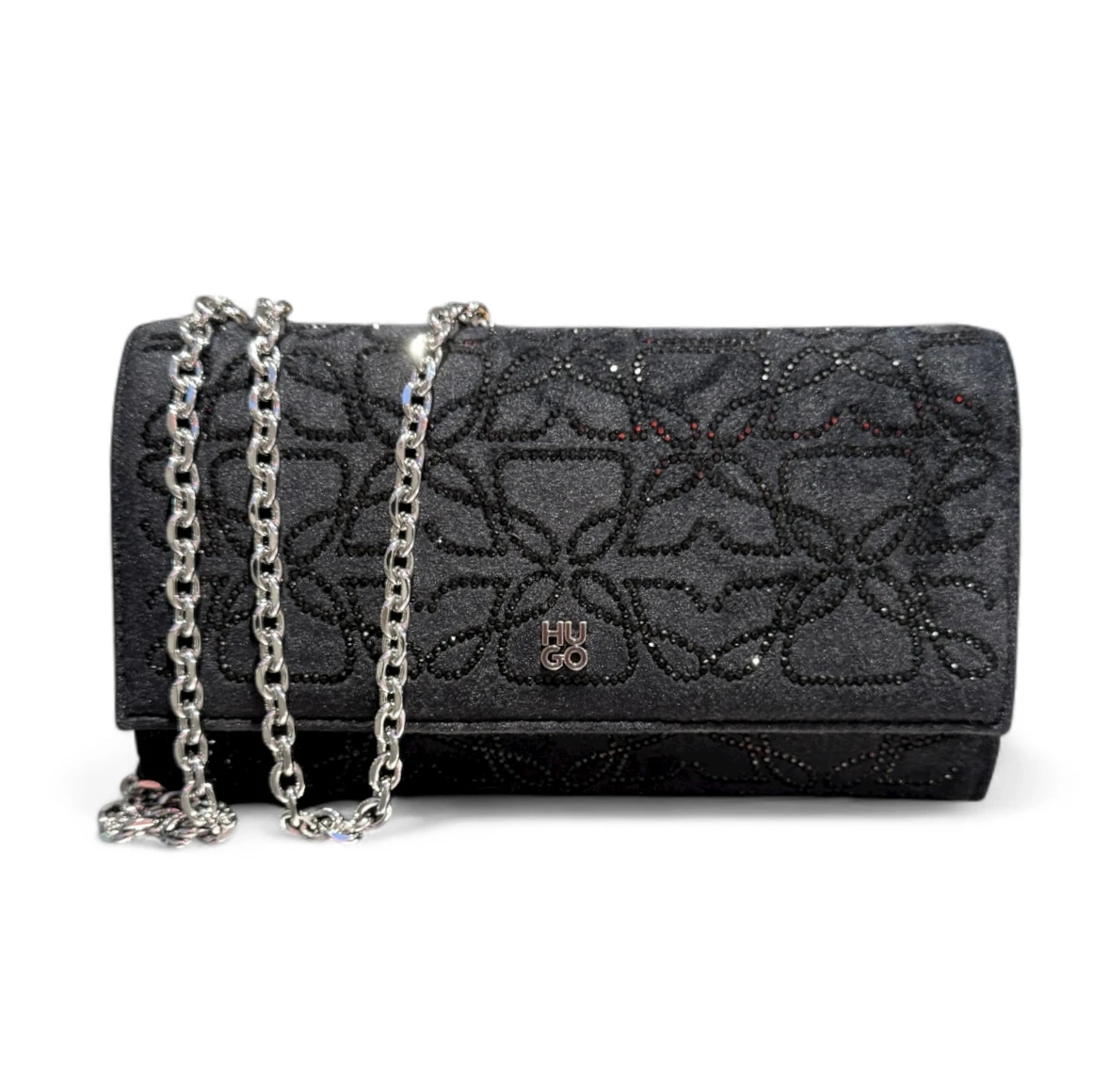 Die HUGO Clutch mit durchgehendem Strass-Muster ist aus einem Gewebe mit Samt-Haptik gefertigt und rundet deine Abend-Looks elegant ab.