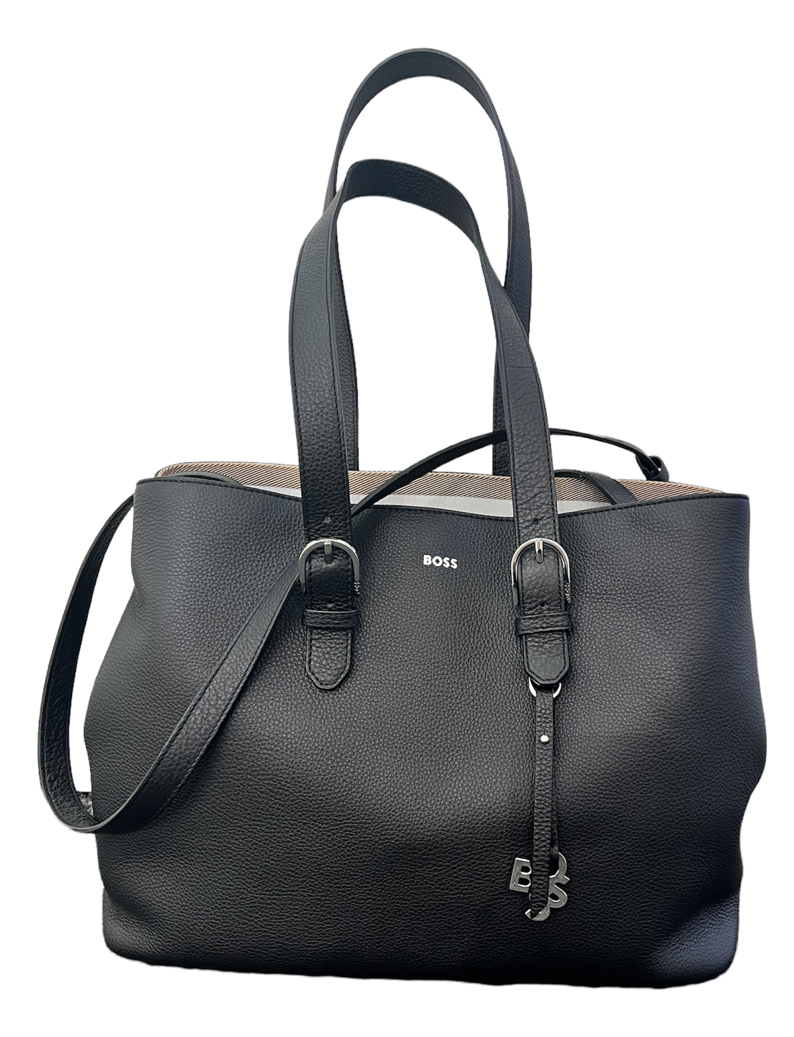 BOSS Tasche im Shopper-Stil. Die Damen-Tasche aus genarbtem Leder ist mit einem markanten Shaken-Logo versehen. Ein verstellbarer Riemen mit charakteristischen Streifen rundet das Design ab.