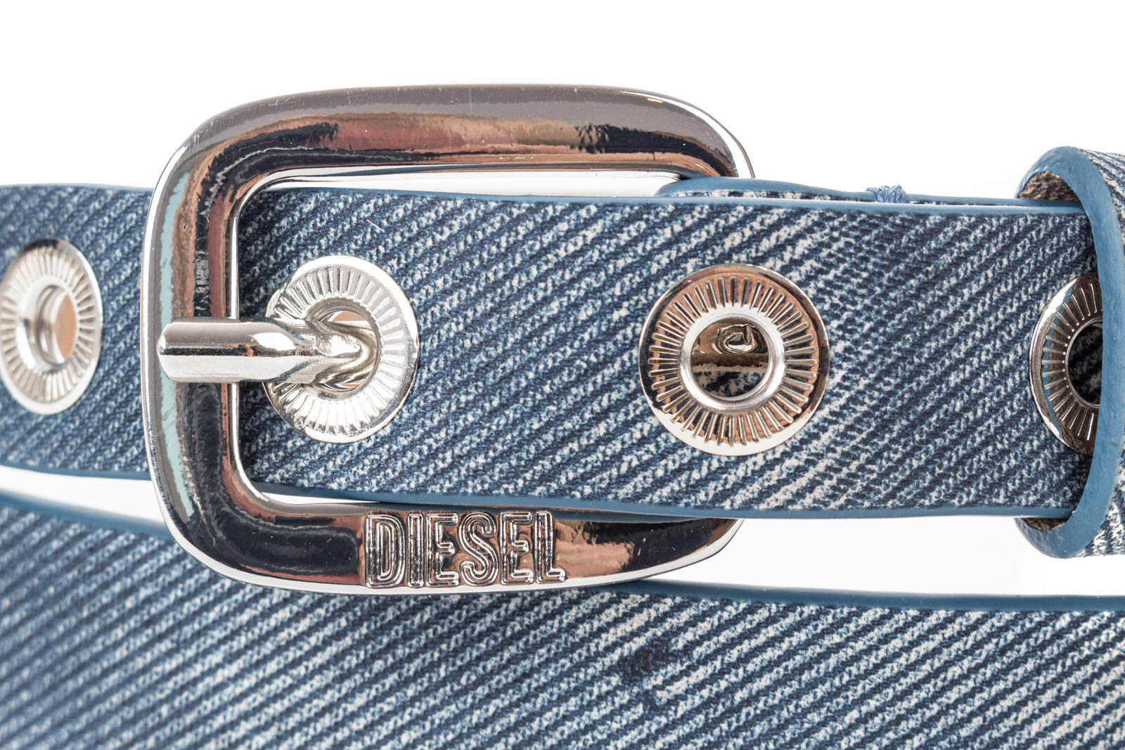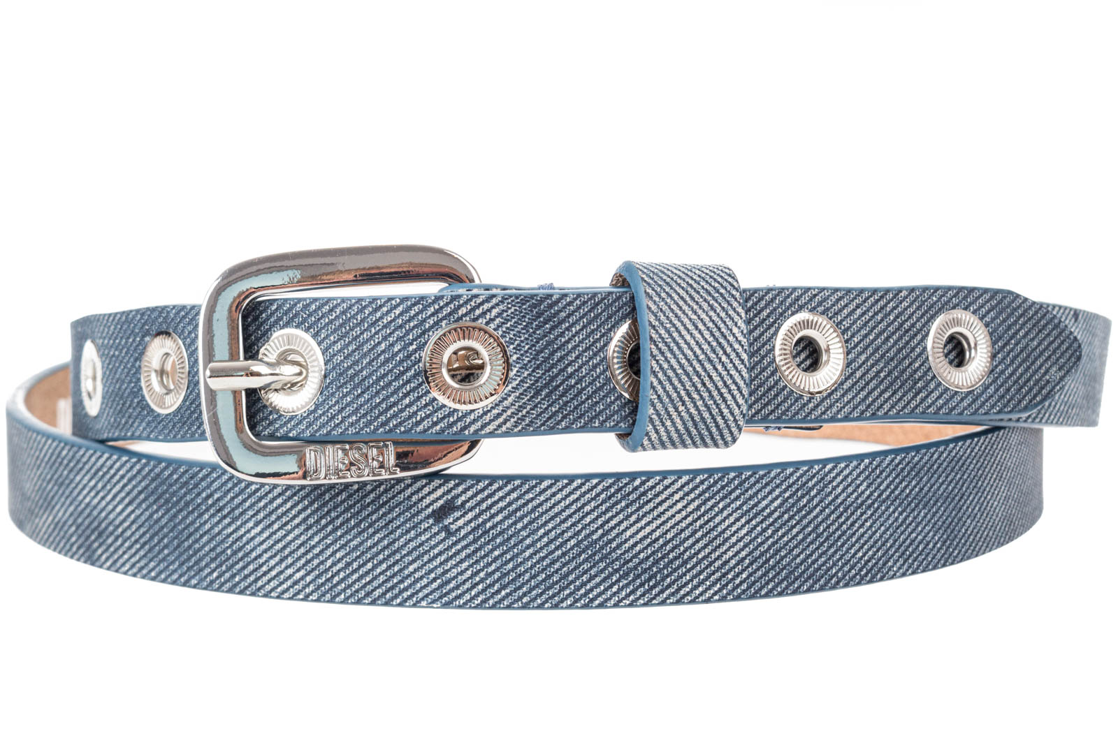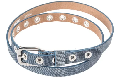 Schmaler Gürtel für Damen aus farbigem Leder mit einer Textur, die die diagonale Twill-Webung von Denim imitiert - den Stoff der DNA von Diesel. Mit fein gezahnten Ösen auf der gesamten Länge.