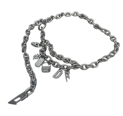 Kettengürtel für Damen mit einer Reihe von Diesel-Anhängern – beachten Sie die Mini-1DR-Tasche, die zwischen den ikonischen Logos baumelt. Er wird mit einem Haken an einer beliebigen Stelle der Länge befestigt.
