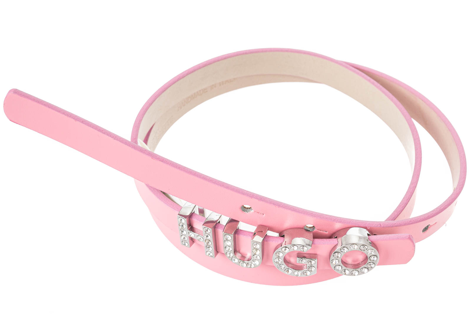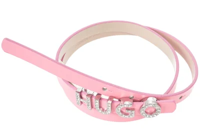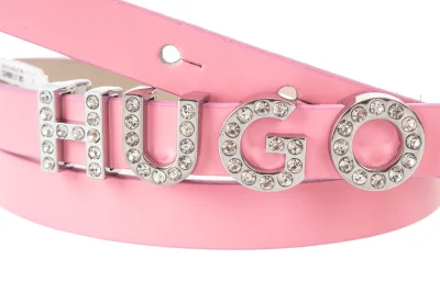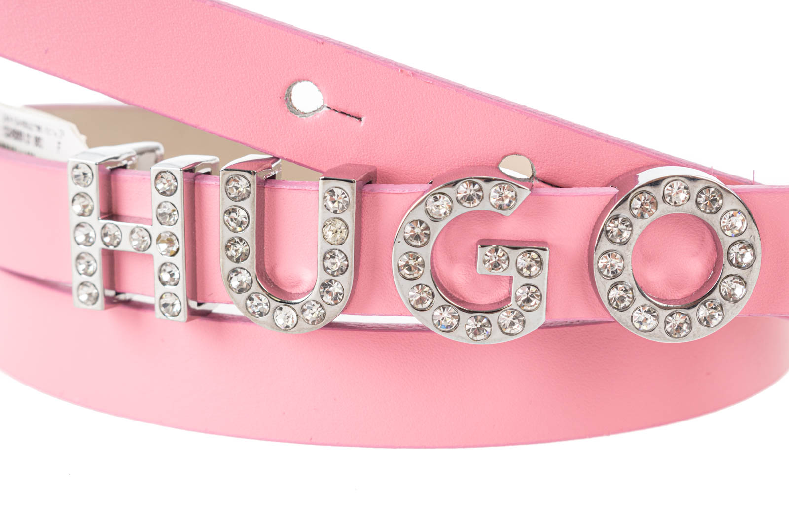 Edler HUGO Gürtel aus italienischem Leder mit 1,5 Zentimetern Breite und kristallbesetzter Logo-Schließe. Für die optimale Passform sollte der Gürtel eine Größe größer als dein Taillenumfang sein
