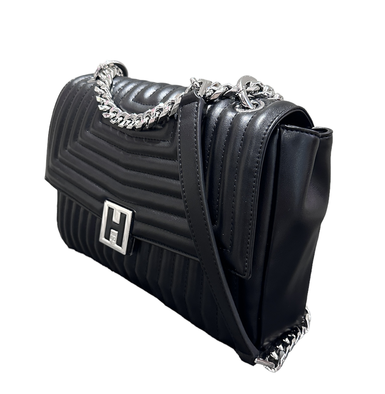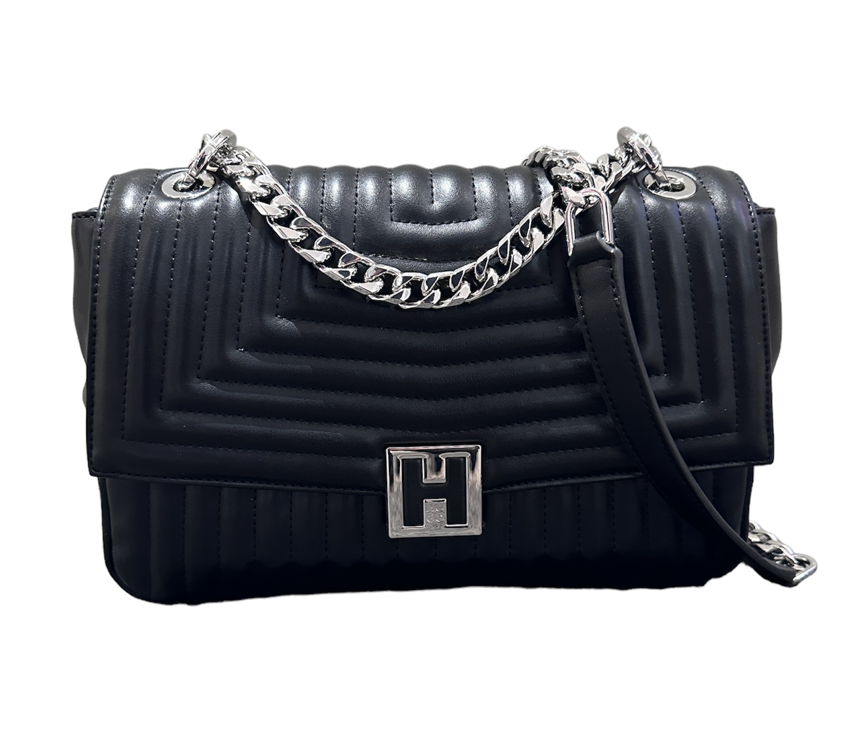 Feminine HUGO Tasche. Die stylishe Damen-Tasche aus einem Material-Mix mit gesteppter Konstruktion ist mit einem polierten Logo im Reversed-Design versehen, das ihr den charakteristischen Touch der neuen Saison verleiht.