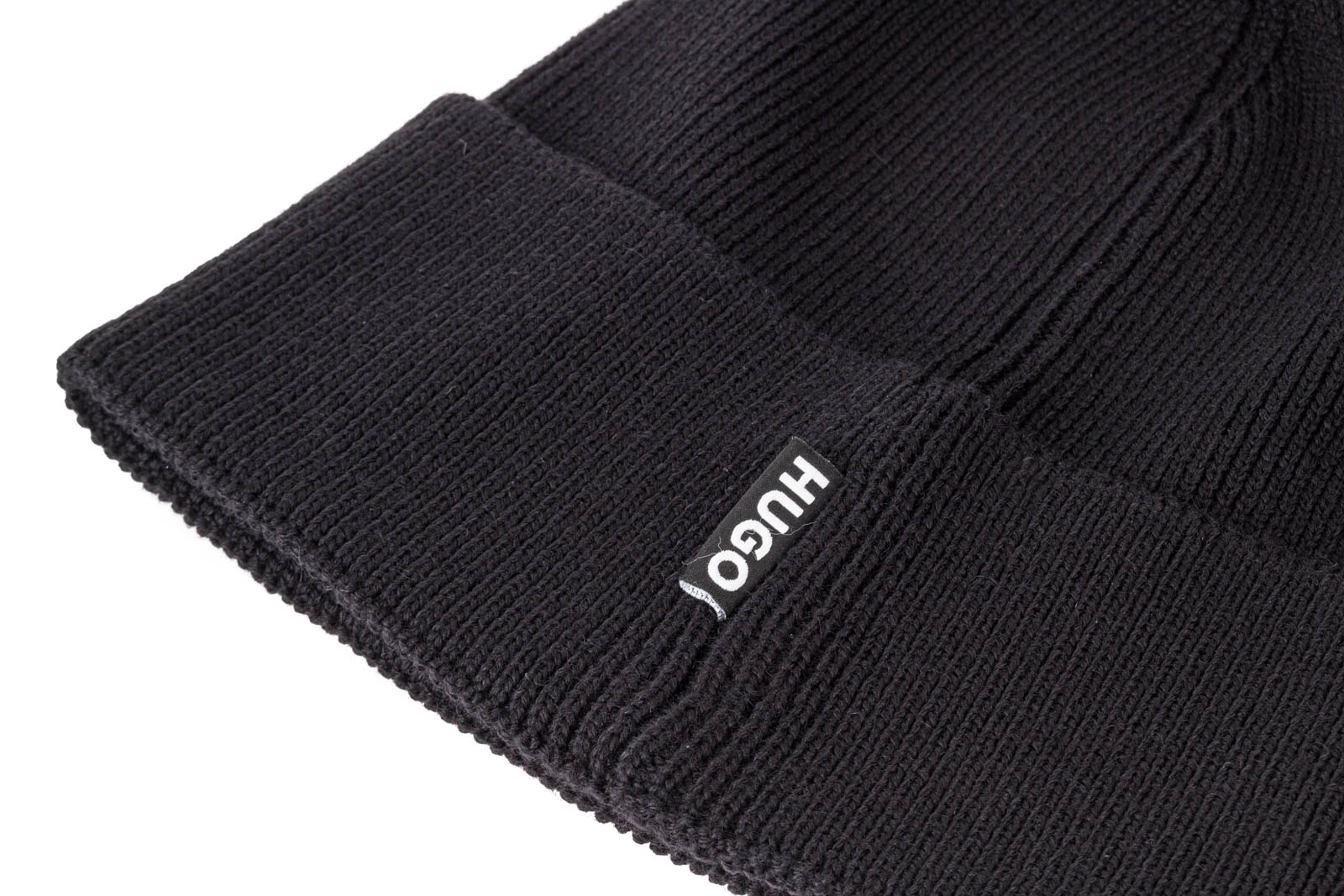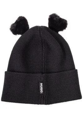 Gerippte HUGO Mütze aus Woll-Mix mit Logo-Etikett und zwei herzförmigen Bommeln.