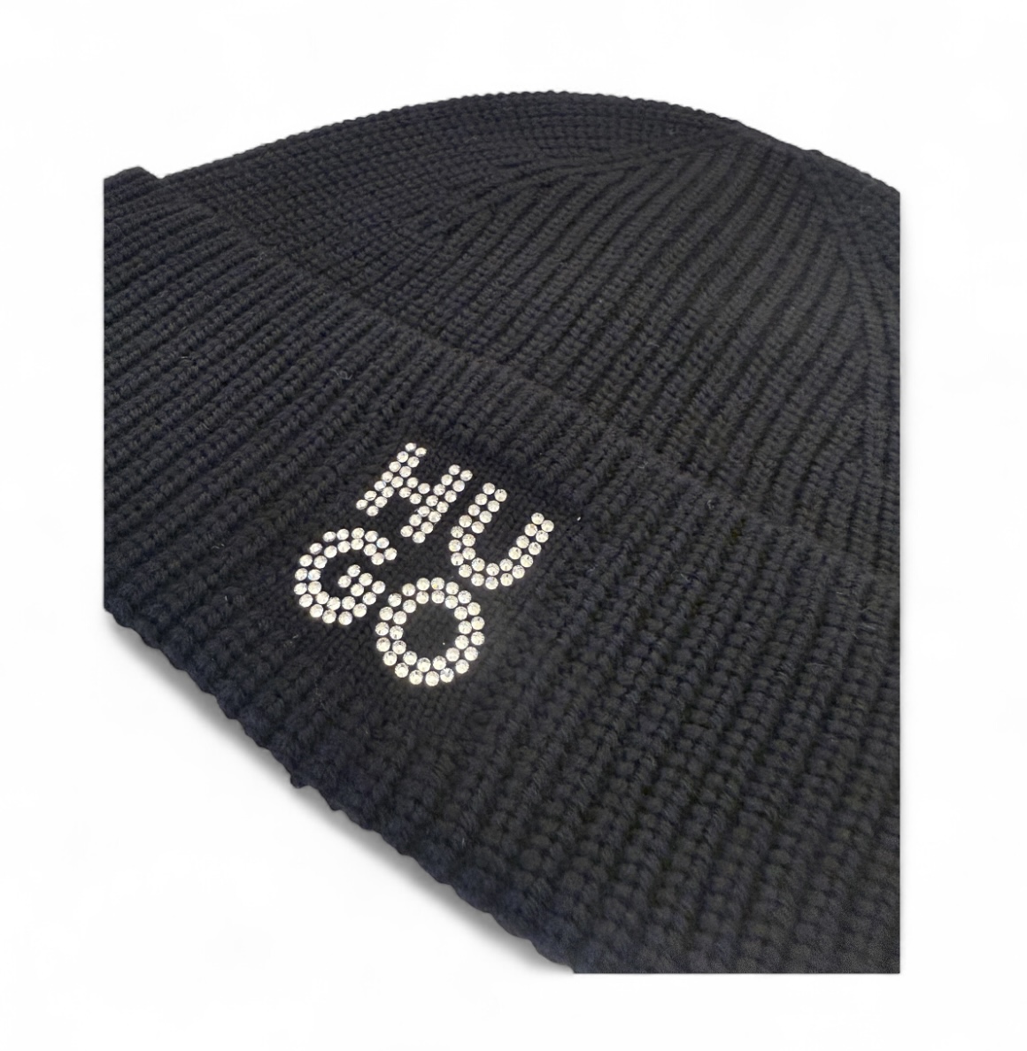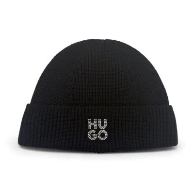 Halte die Kälte fern mit dieser HUGO Mütze, gestrickt mit Ripp-Struktur aus atmungsaktivem Woll-Mix. Logo-Label aus Strass-Steinen.