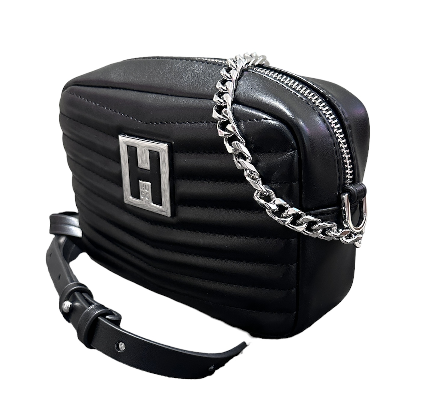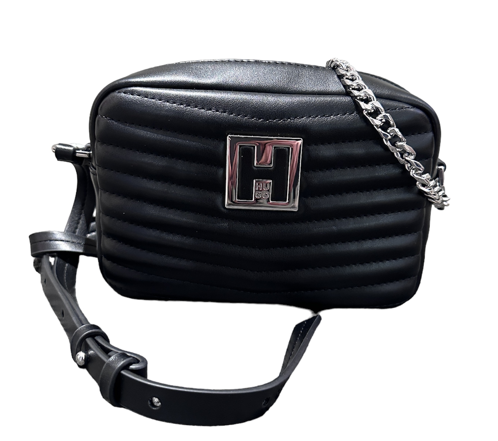 Feminine HUGO Tasche. Die stylishe Damen-Tasche aus einem Material-Mix mit gesteppter Konstruktion ist mit einem polierten Logo im Reversed-Design versehen, das ihr den charakteristischen Touch der neuen Saison verleiht.