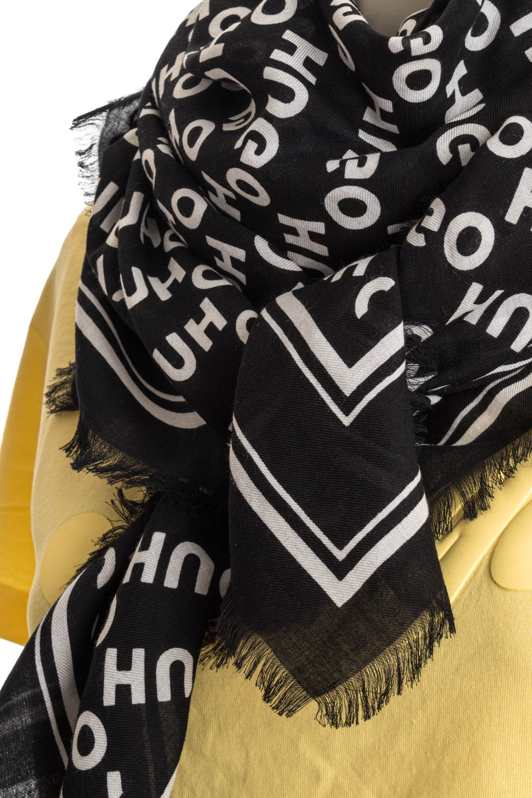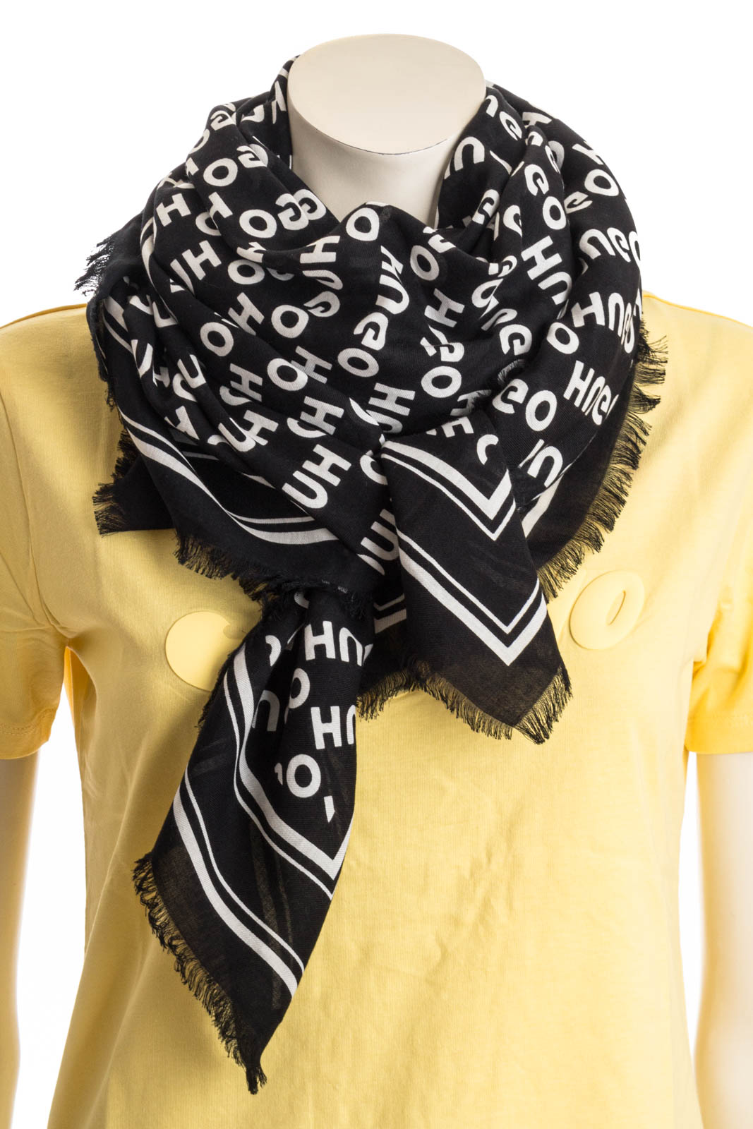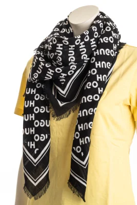 Markanter HUGO Schal. Das quadratische Accessoire aus einem soften Gewebe ist mit einem charakteristischen Allover-Print und Fransen an den Kanten versehen.