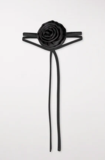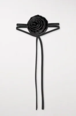 Schmales Halsband mit blütenförmiger Applikation aus dezent glänzendem Satin. Das Halsband lässt sich individuell binden und auch als Gürtel tragen.