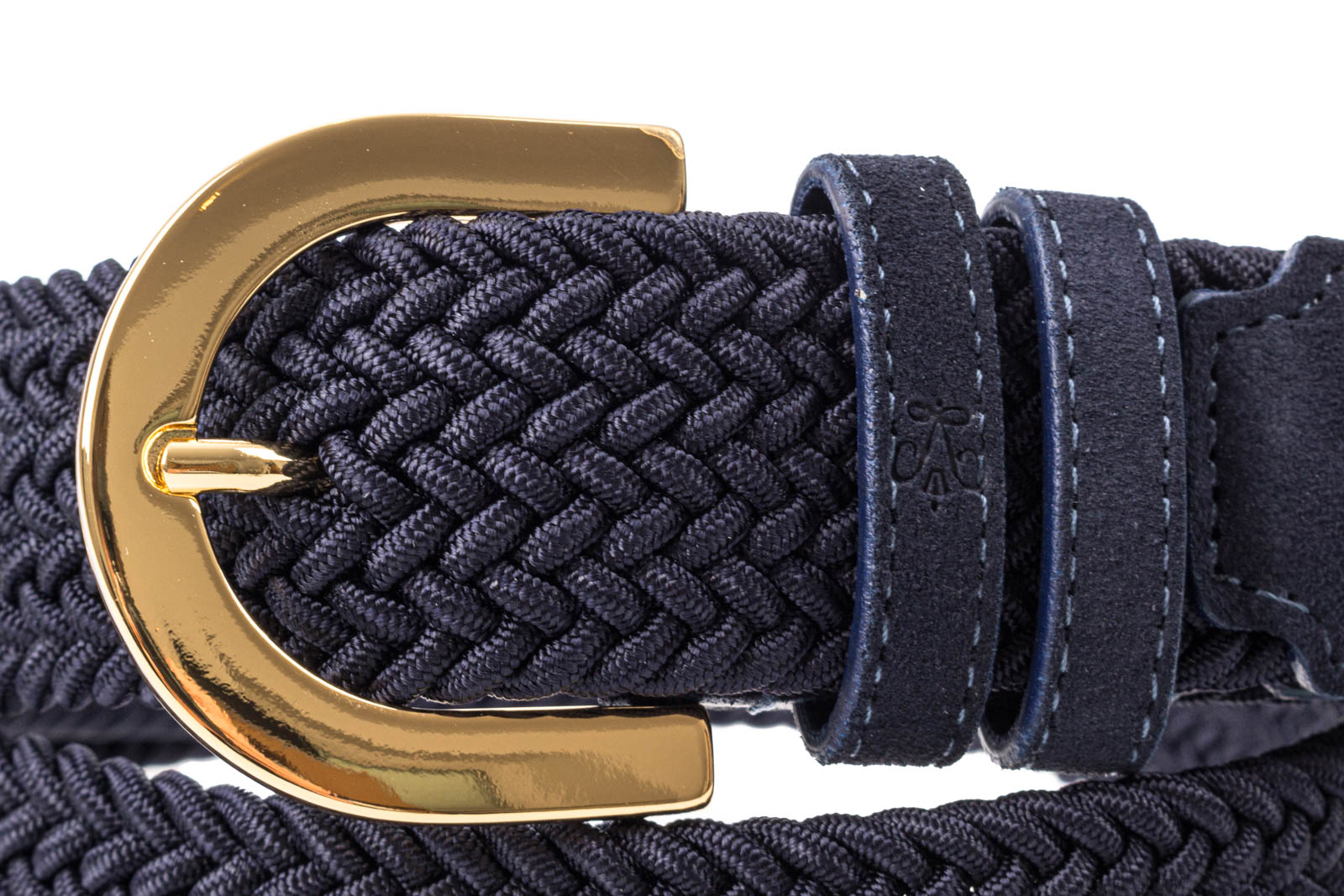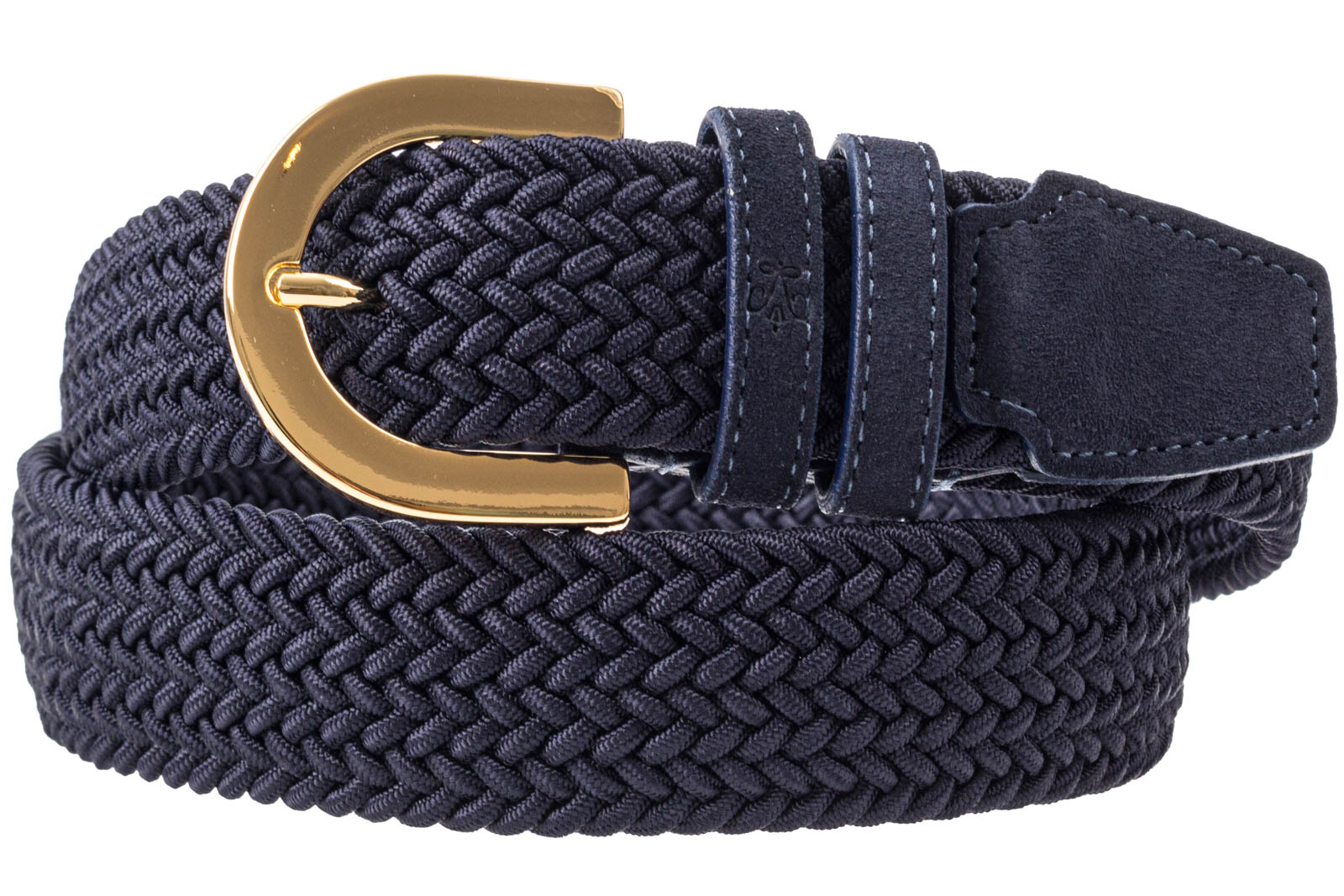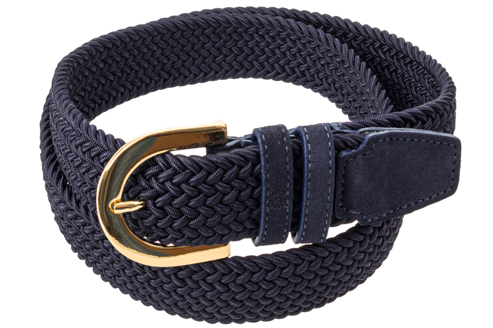 Der geflochtene Stretch-Elastikgürtel mit Lederspitzen und goldfarbener Metallschnalle vereint mühelos Stil und Komfort.