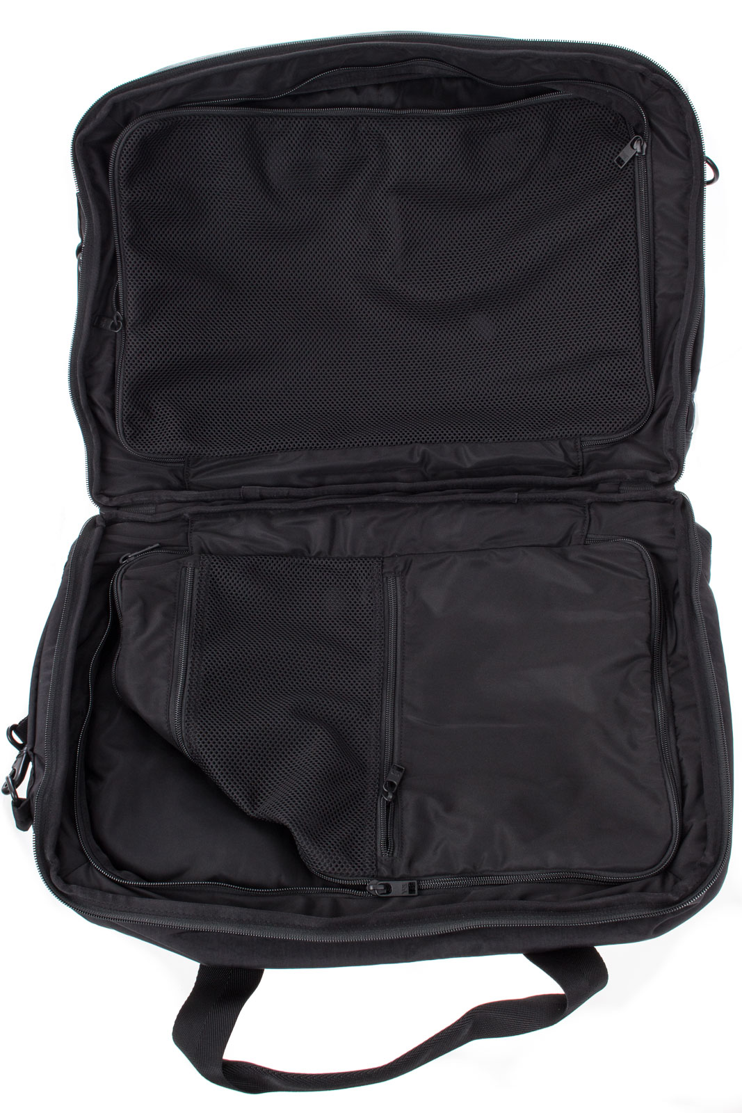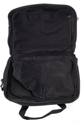 Innenfächer mit Reißverschluss, vorderes Fach mit Reißverschluss und Hintertasche mit Reißverschluss.