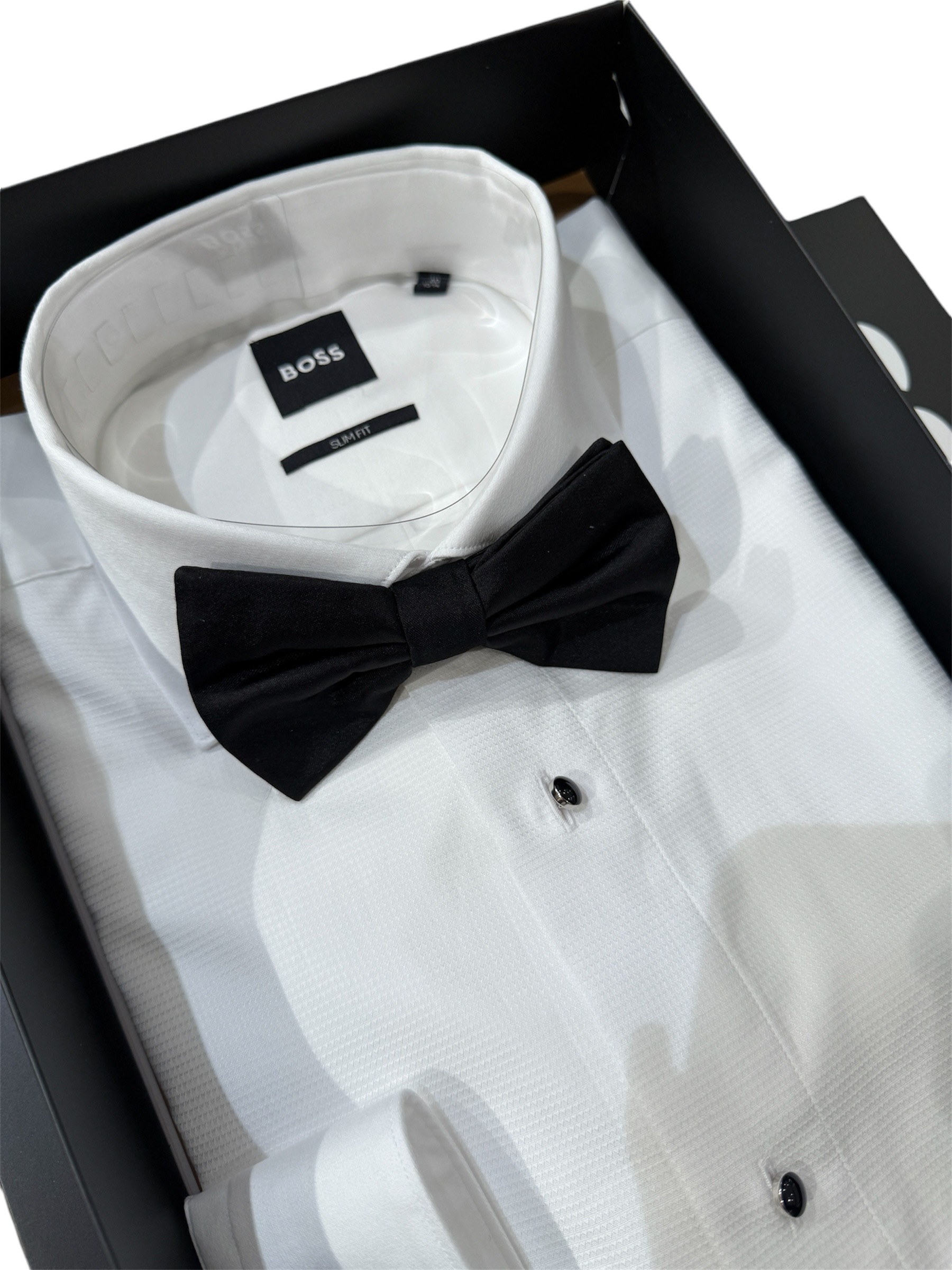 BOSS Smoking-Hemd mit Fliege und Nieten. Das schmal geschnittene Hemd ist aus elastischer Baumwolle mit einem Latzeinsatz aus reiner Baumwolle gefertigt.