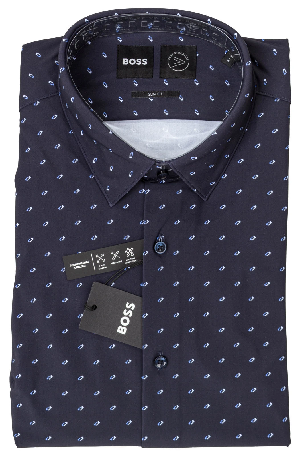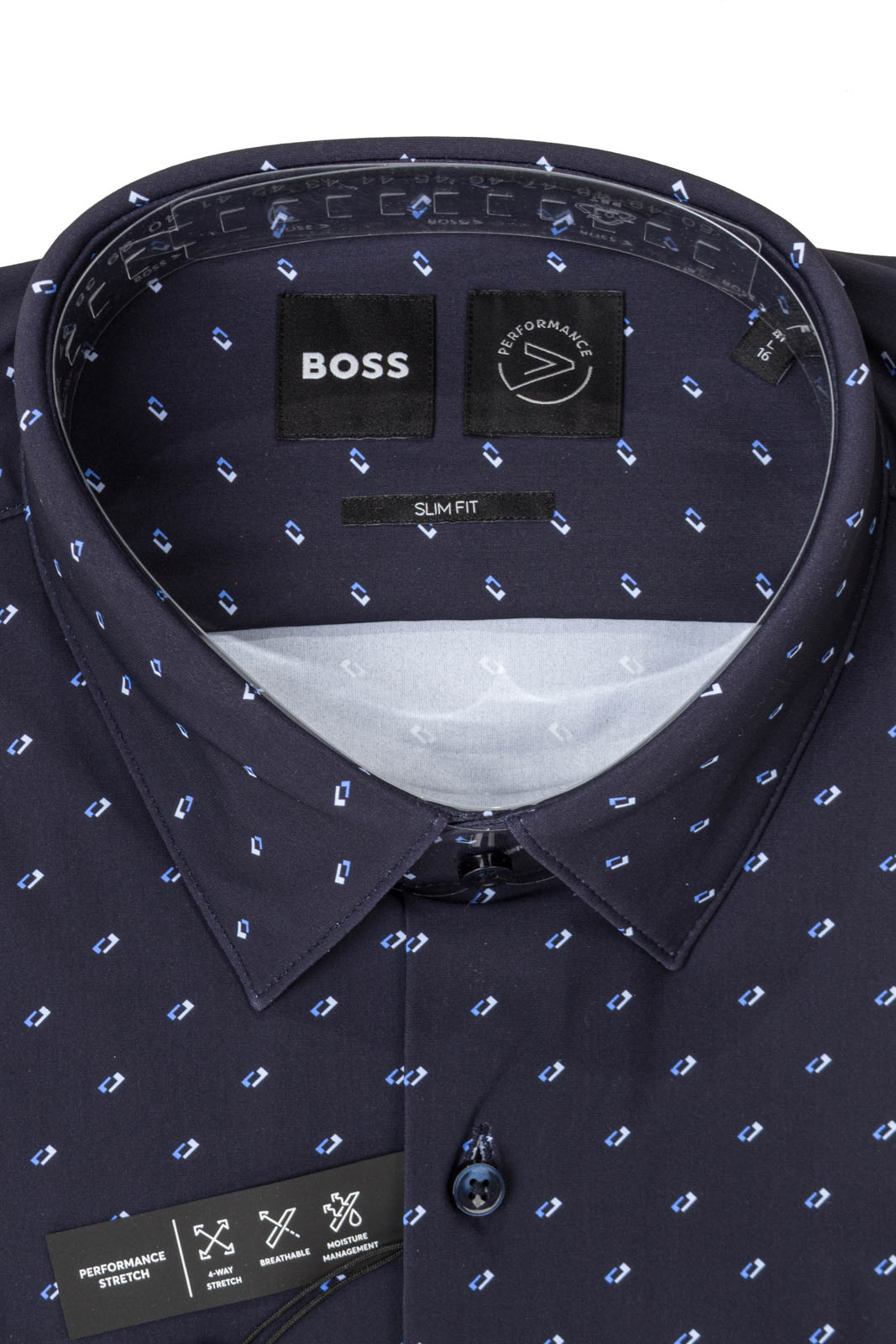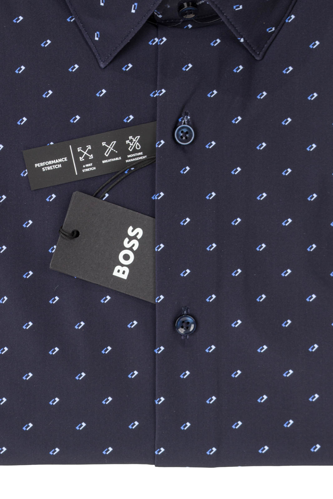 Das BOSS Menswear Hemd mit cleaner Passform und zeitgemäßem Print ist dank des hohen Elasthan-Anteils besonders bequem. Kentkragen.