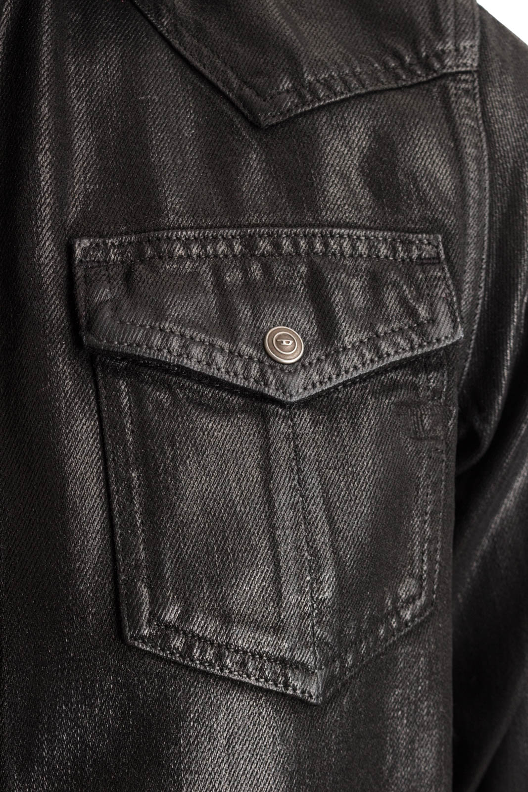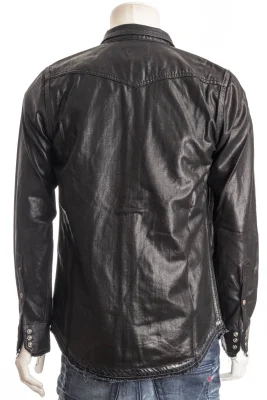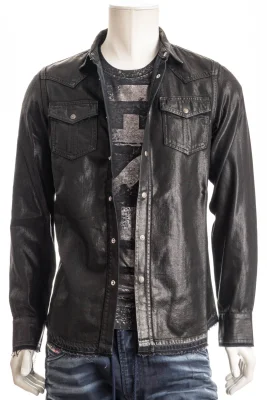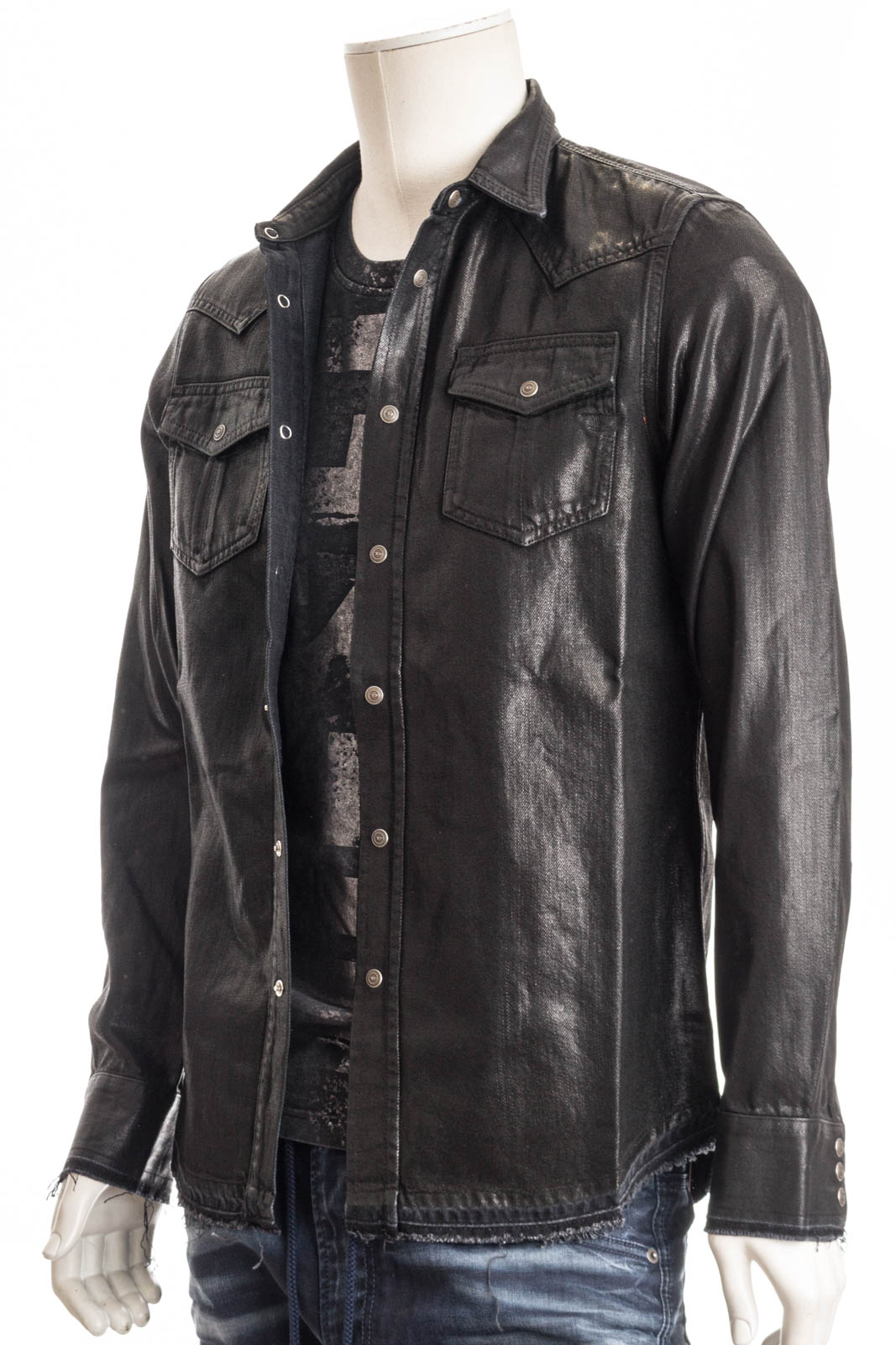Langarm-Hemd für Herren. Kann auch als leichte Jacke getragen werden. Mit spitzen Westernpassen an Vorder- und Rückseite, Klappentaschen und Druckknöpfen aus Metall. Es wurde allover besprüht, um eine schwarze Beschichtung zu erzeugen, und für ein besonders glänzendes Finish gepresst.