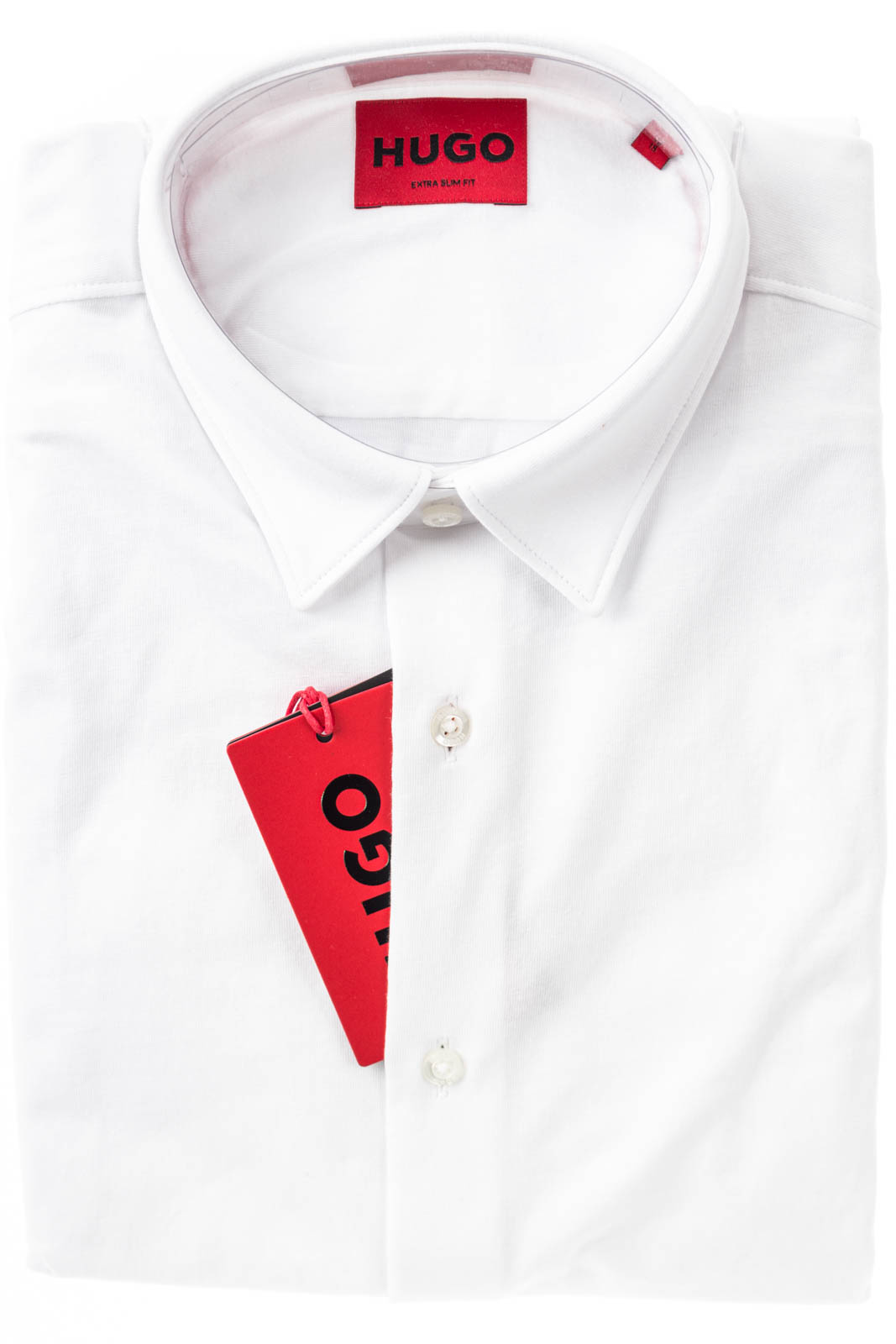 HUGO Business-Hemd mit innovativen Eigenschaften. Das extra schmal geschnittene Herren-Hemd mit cleaner Silhouette ist aus funktionalem Stretch-Jersey gefertigt, der optimale Bewegungsfreiheit garantiert. Ein Kentkragen und angeschrägte Manschetten runden den Style ab.