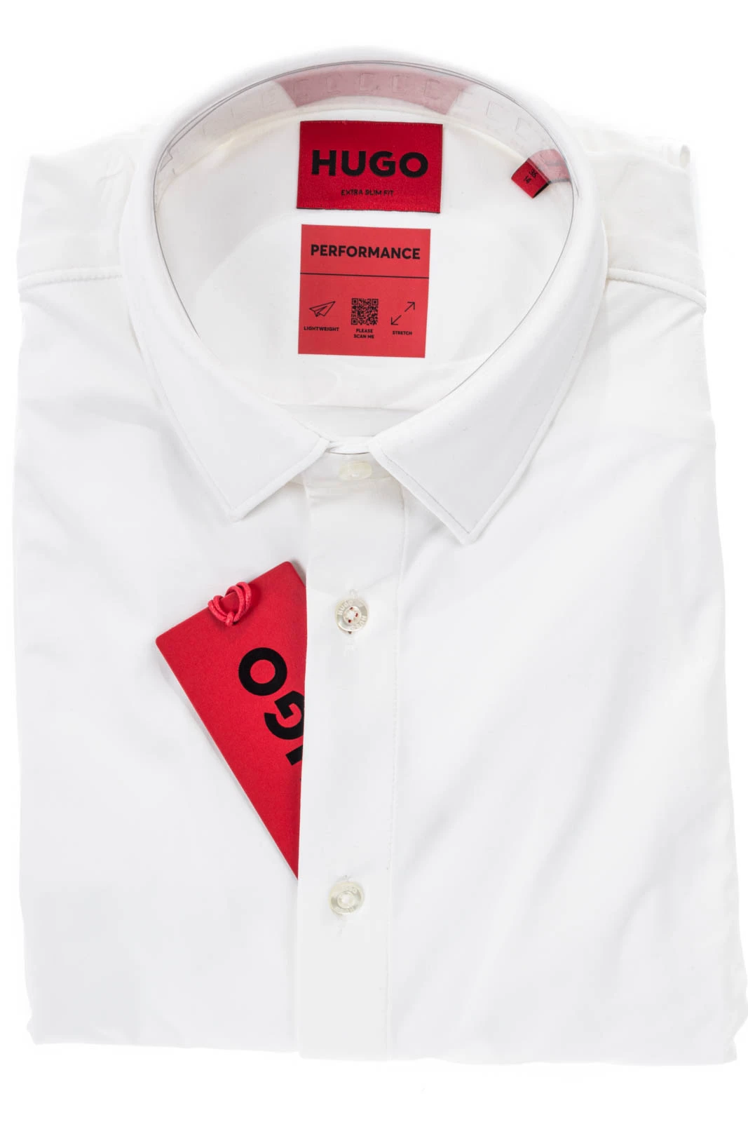 HUGO Business-Hemd mit innovativen Eigenschaften. Das extra schmal geschnittene Herren-Hemd mit cleaner Silhouette ist aus funktionalem Stretch-Jersey gefertigt, der optimale Bewegungsfreiheit garantiert. Ein Kentkragen und angeschrägte Manschetten runden den Style ab.
