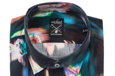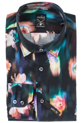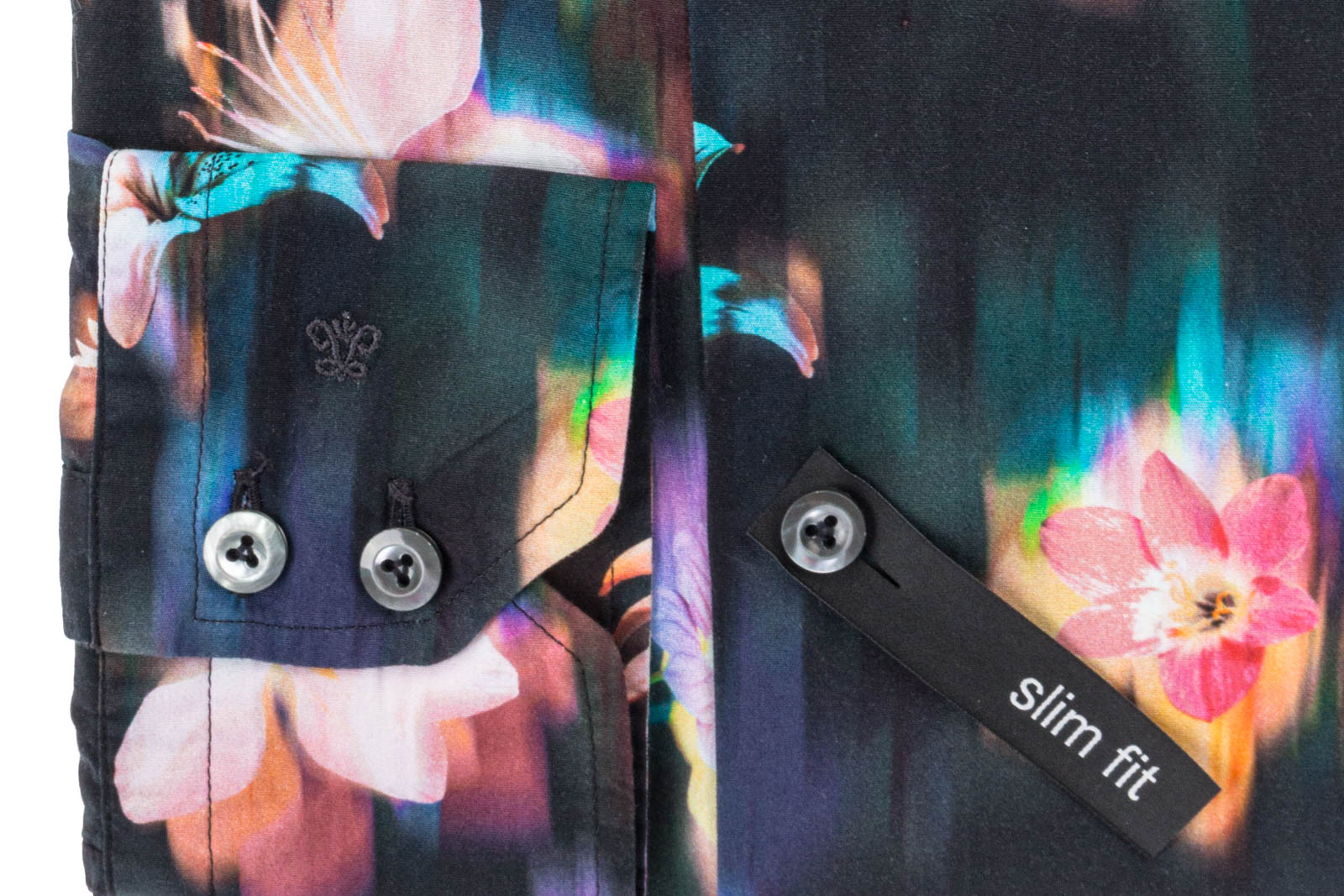 Das gewaschene Hemd ist ausem Popeline-Material mit einem Blumen-Kunst-Druck Motiv gefertigt.