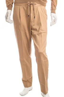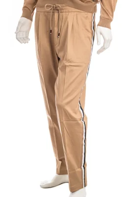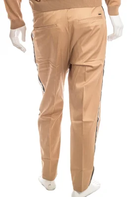 Die Herren-Hose mit mittlerer Bundhöhe und Bundfalten auf der Vorderseite ist aus edler italienischer Gabardine mit Baumwoll- und Elasthan-Anteil gefertigt. Charakteristische Streifen an den Beinen setzen markante Akzente.