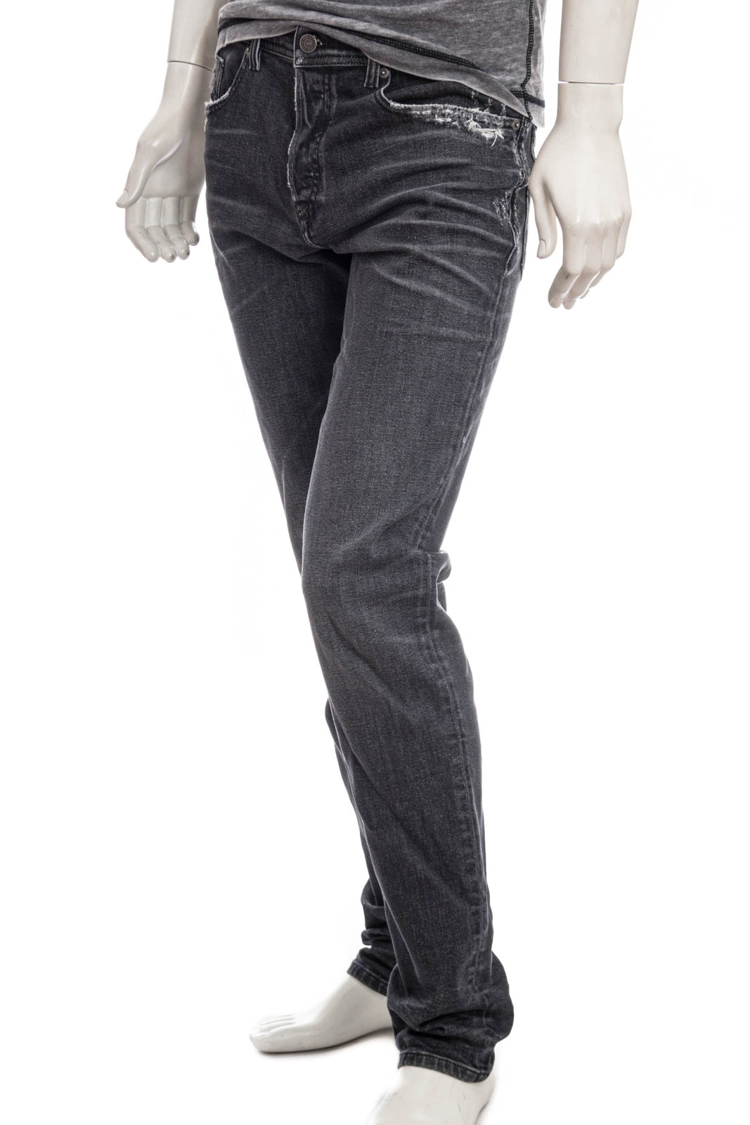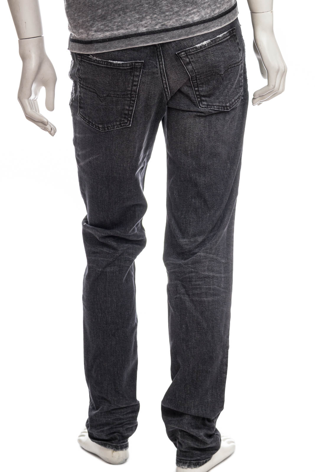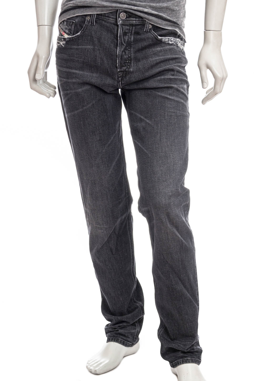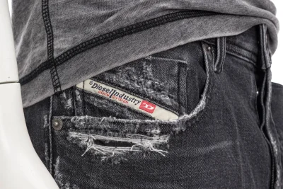 Komfortdenims aus Recyclingbaumwolle in einer schwarzen Waschung, mit Abrieb- und Reparaturstellen an Bund und Taschen - ein authentischer ikonischer Look, der die plakativ-disruptive DNA von Diesel verkörpert.