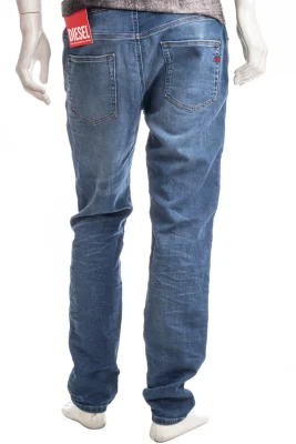 Diese DNA-Waschung hat einen mittelblauen Farbton mit charakteristischen Behandlungen wie Whisker-Falten und 3D-Finish. Mit aufgesticktem rotem D.