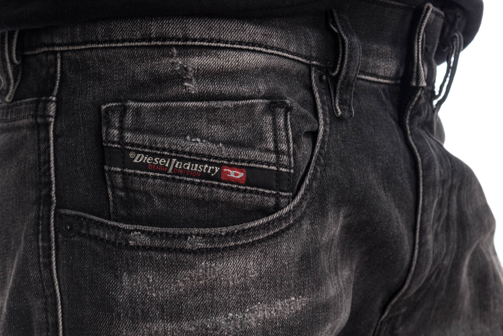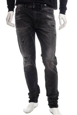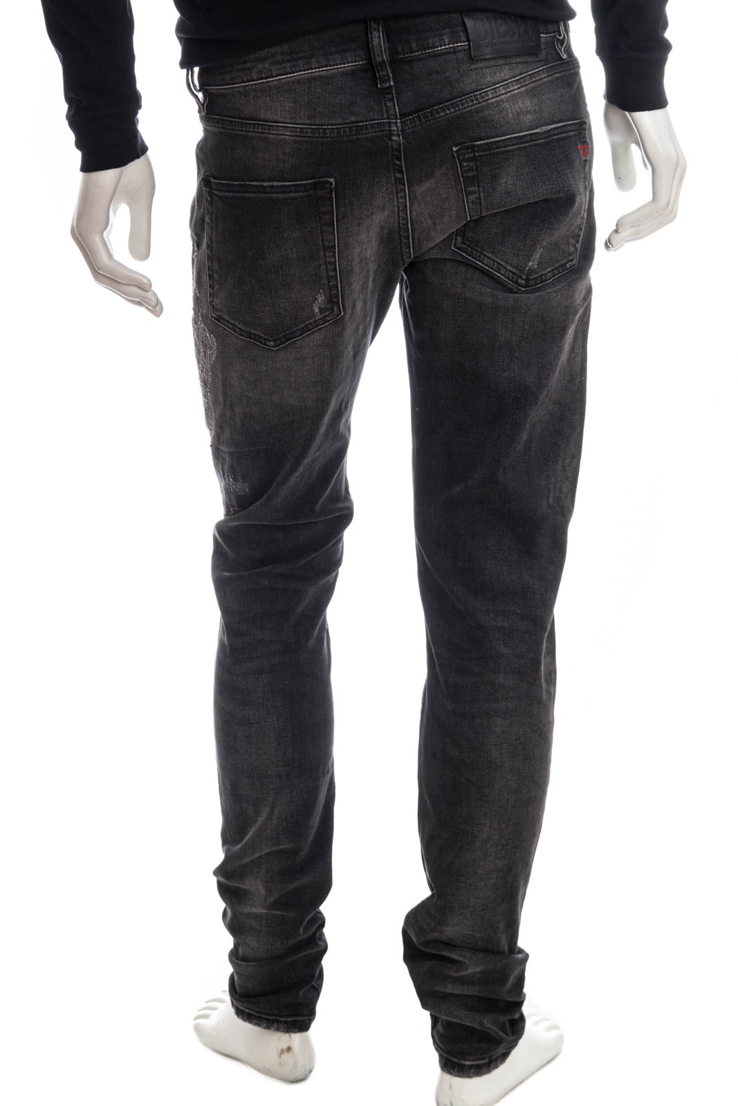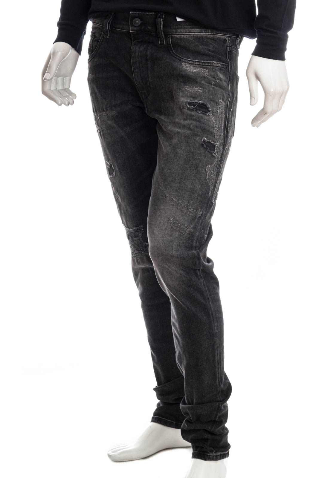 Eine schmal geschnittene Jeans in schlichter Optik mit Falten- sowie Riss- und Flickdetails