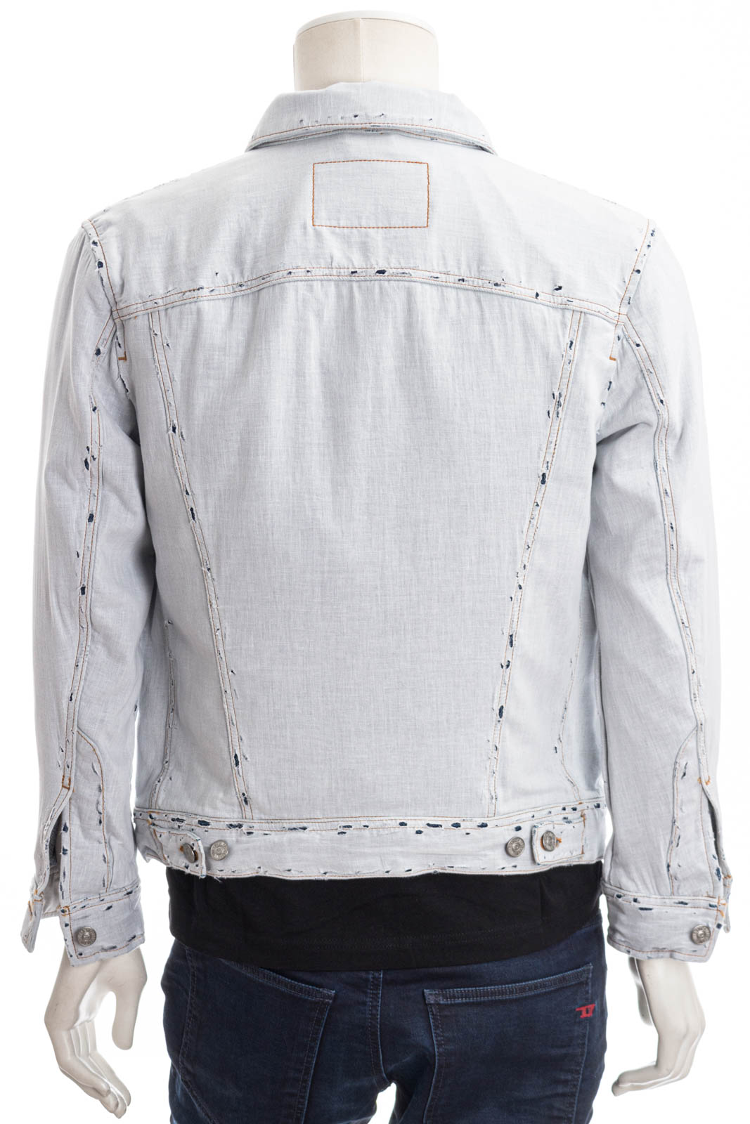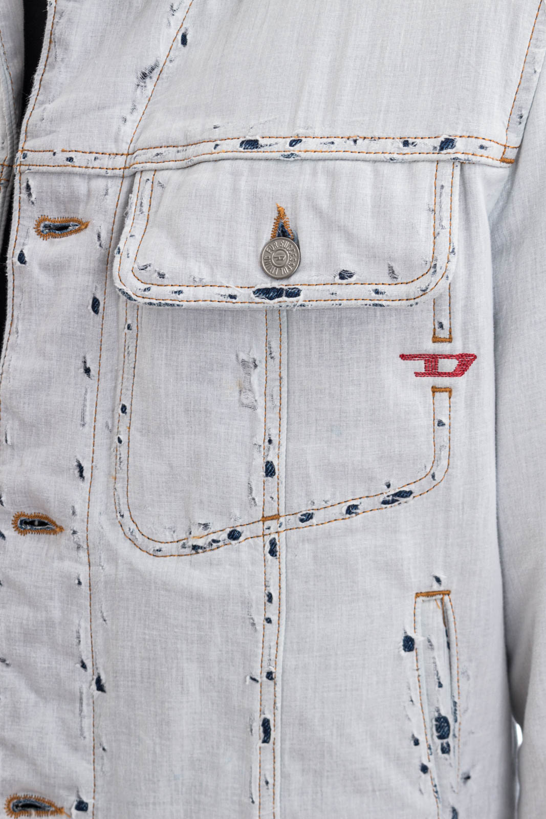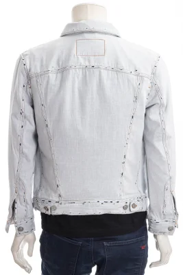 Dieser exklusive Trucker-Stil hat eine normale Passform mit klassischen Vordernähten und geknöpften Brusttaschen. Diese raffinierte und experimentelle Waschung ist aus festem Denim und mit naturweißem Musselin überzogen, das mit Stonewashed-Effekten zerrissene und rohe Effekte erzeugt.