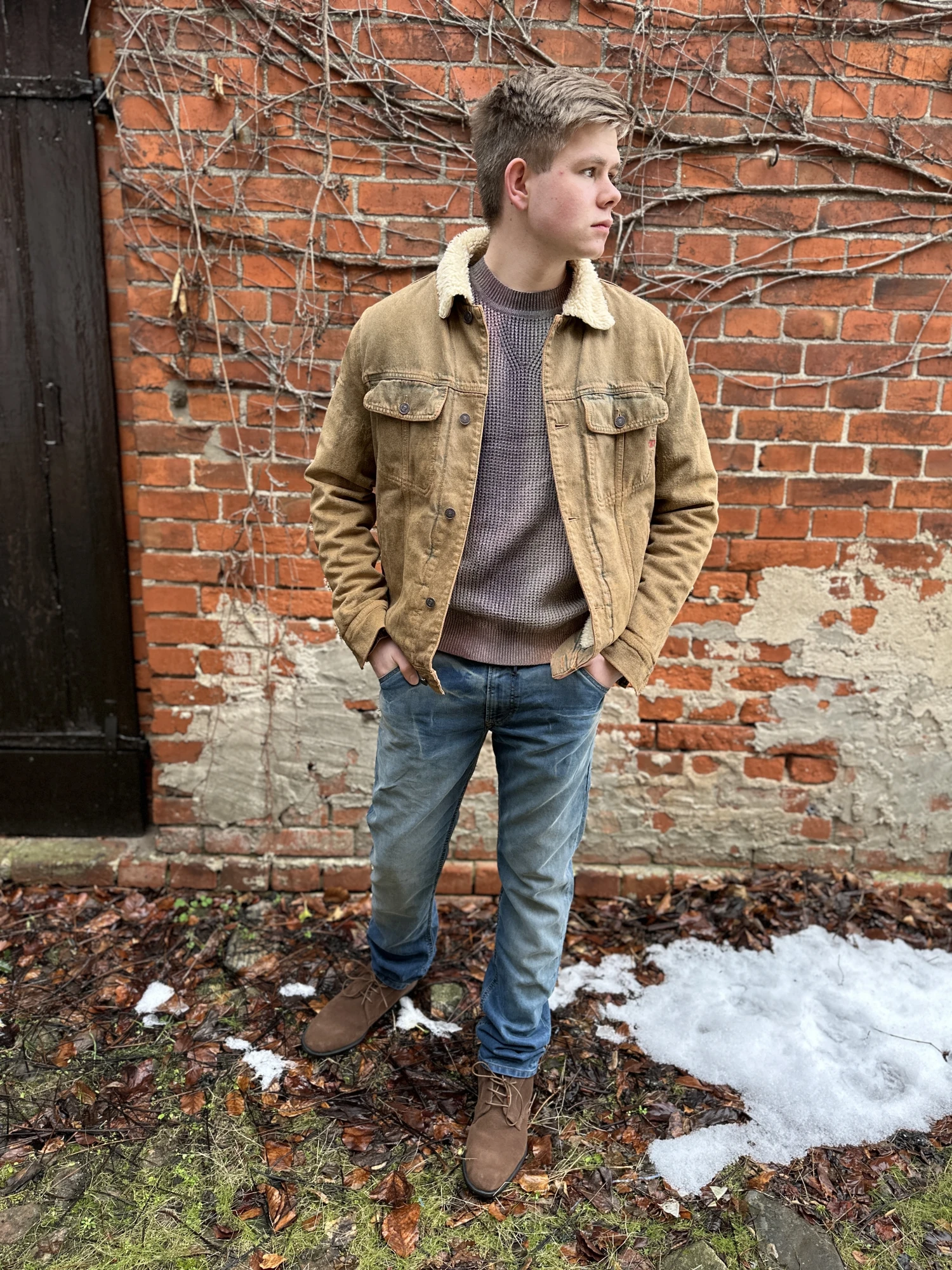 Truckerjacke für Herren aus Samtdenim in regulärer Passform. Weiches, ecrufarbenes Teddyfell als Futter und Kragen hält im Winter warm.