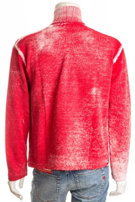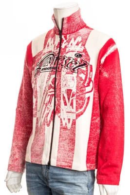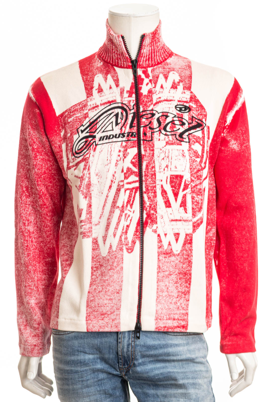 Dieser gestreifte Cardigan für Herren besticht durch ein ungleichmäßig gesättigtes rot-weißes Design, das durch einen Aufdruck auf der Innenseite des Kleidungsstücks entsteht. Gestrickt aus Bio-Baumwolle, er hat einen hohen Kragen, einen regulären Fit und einen Zwei-Wege-Reißverschluss. Beachten Sie die coole grafische Mischung aus Logos und dem Ausschnitt und dem gestickten Oval D auf der Brust.