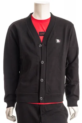 Charakteristische HUGO Strickjacke mit gummiertem Logo-Etikett. Die locker geschnittene Jacke mit Knopfleiste ist aus schwerem Baumwoll-Terry gefertigt.