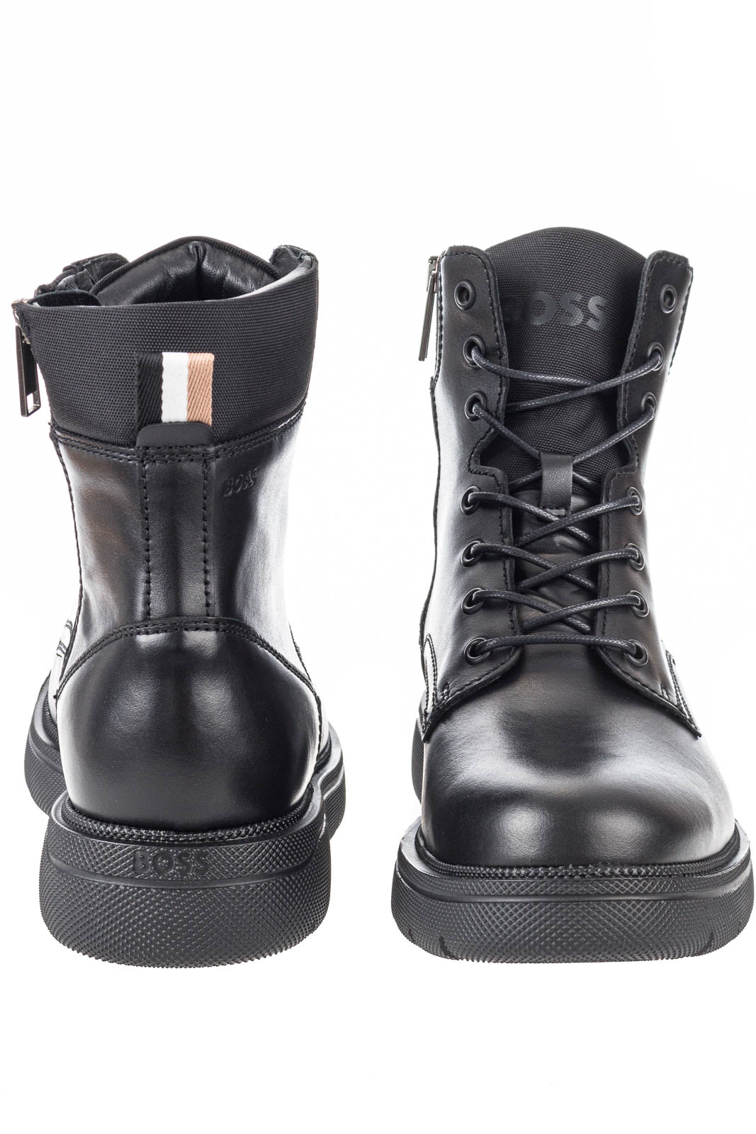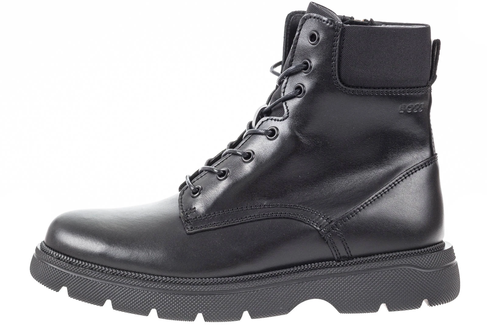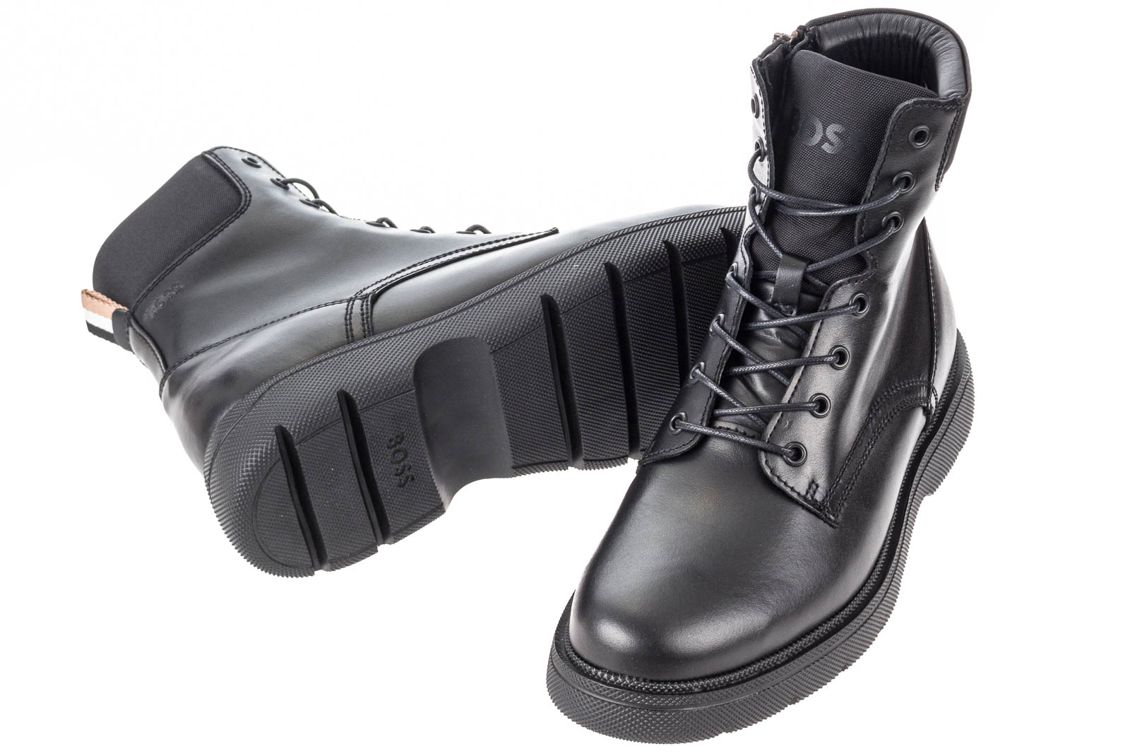 Modische BOSS Stiefel. Die Herren-Boots aus Glattleder sind mit einer SchnĂĽrung und einem ReiĂźverschluss versehen. Logos an der Lasche, am Schaft und an der Sohle kennzeichnen das Paar. Ein Detail mit Signature-Streifen verleiht den Schuhen das gewisse Etwas.