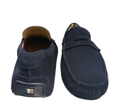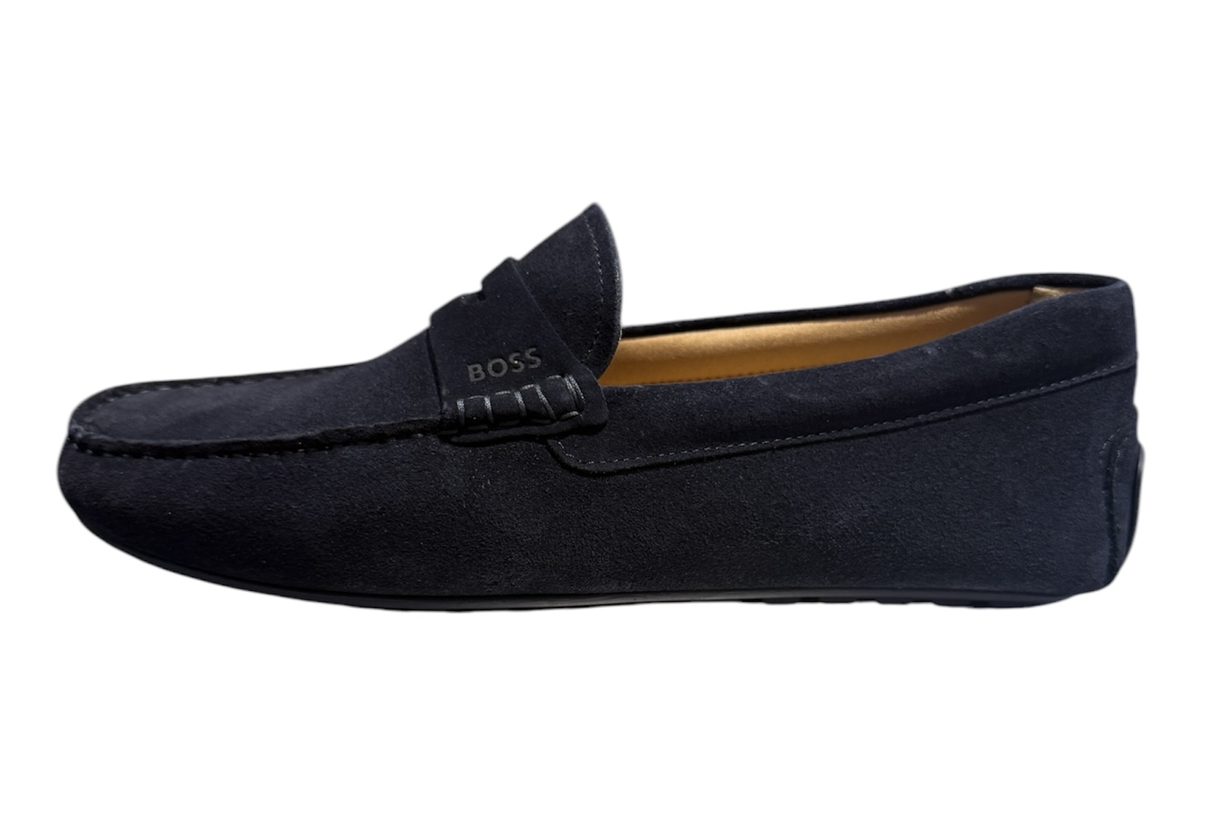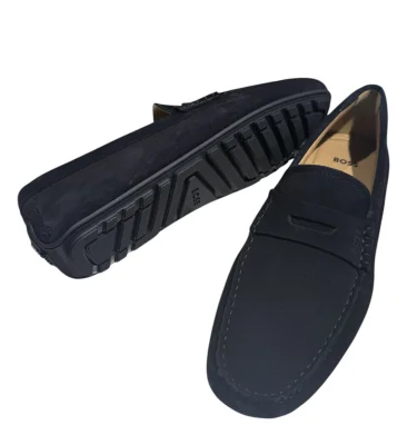 Die zeitlosen BOSS Loafer aus softem Veloursleder präsentieren sich mit flexibler Mokassin-Konstruktion, die optimalen Halt verspricht. Pennyloafer-Detail mit Logo-Prägung.