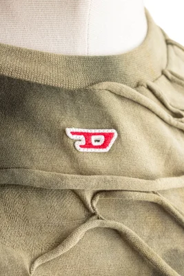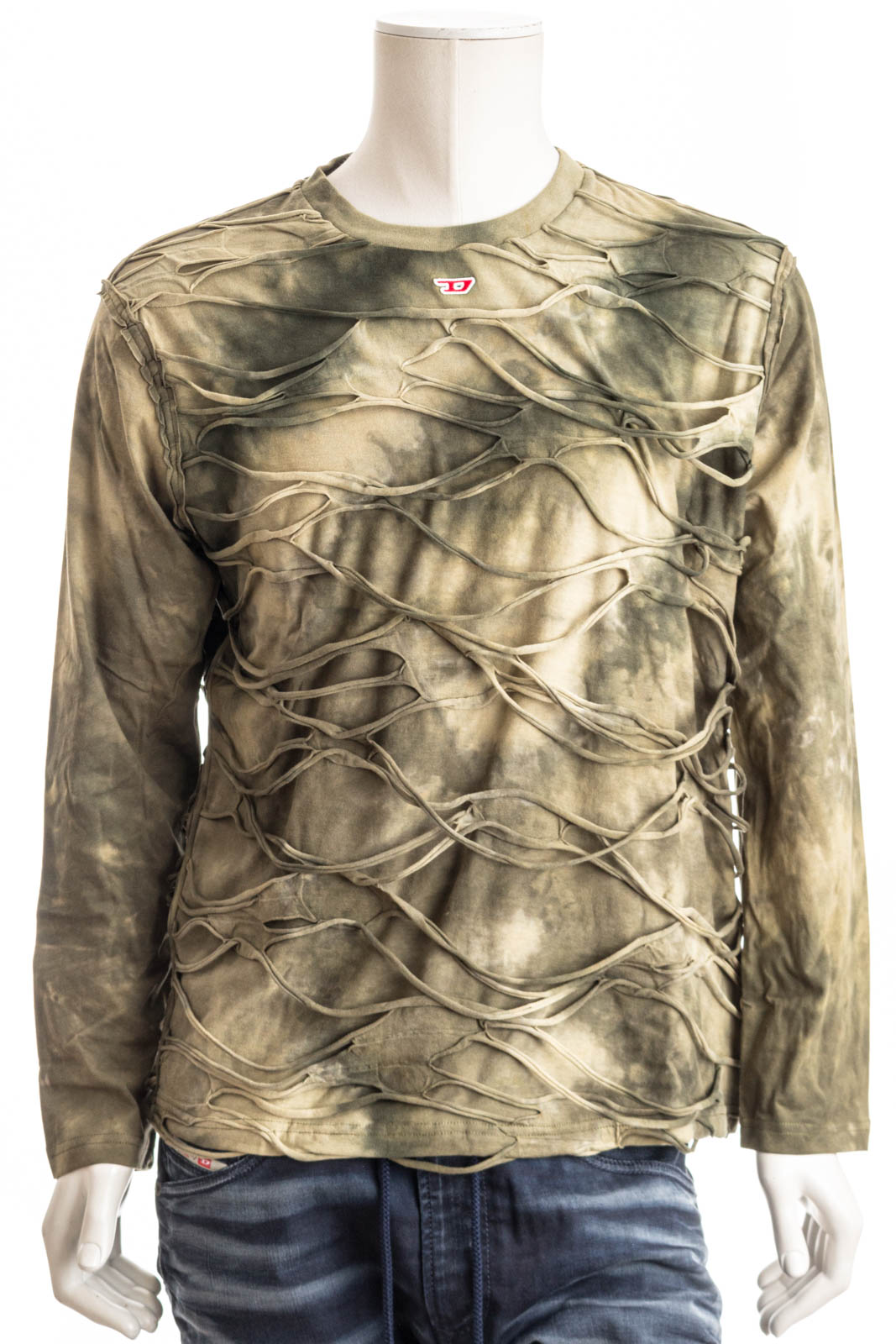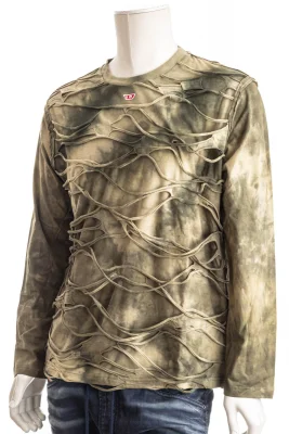 Langarm-T-Shirt für Herren in lockerem Fit aus grünem Baumwolljersey mit Batik-Finish. Ein Netz aus gerollten offenkantigen Fäden aus farblich abgestimmtem Stoff überzieht mit einem schwebenden Effekt das Kleidungsstück. Ein kleines aufgesticktes D-Patch am Hals rundet das T-Shirt ab.