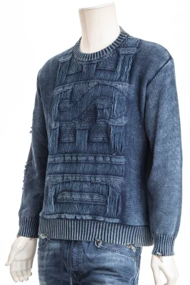 Dieser Pullover für Herren aus Biobaumwolle hat den Destroyed-Look eines alten Lieblingsstücks – Ärmelabschlüsse und Saum sind mit gezogenen Fäden versehen, während aufgetrennte, eingerissene Partien an den Ärmeln ihre innere Struktur offenlegen. Das übergroße, vertikale Logo ist geschickt mit fließenden Garnen gestrickt und verleiht ihm ein einzigartiges Strukturdetail.