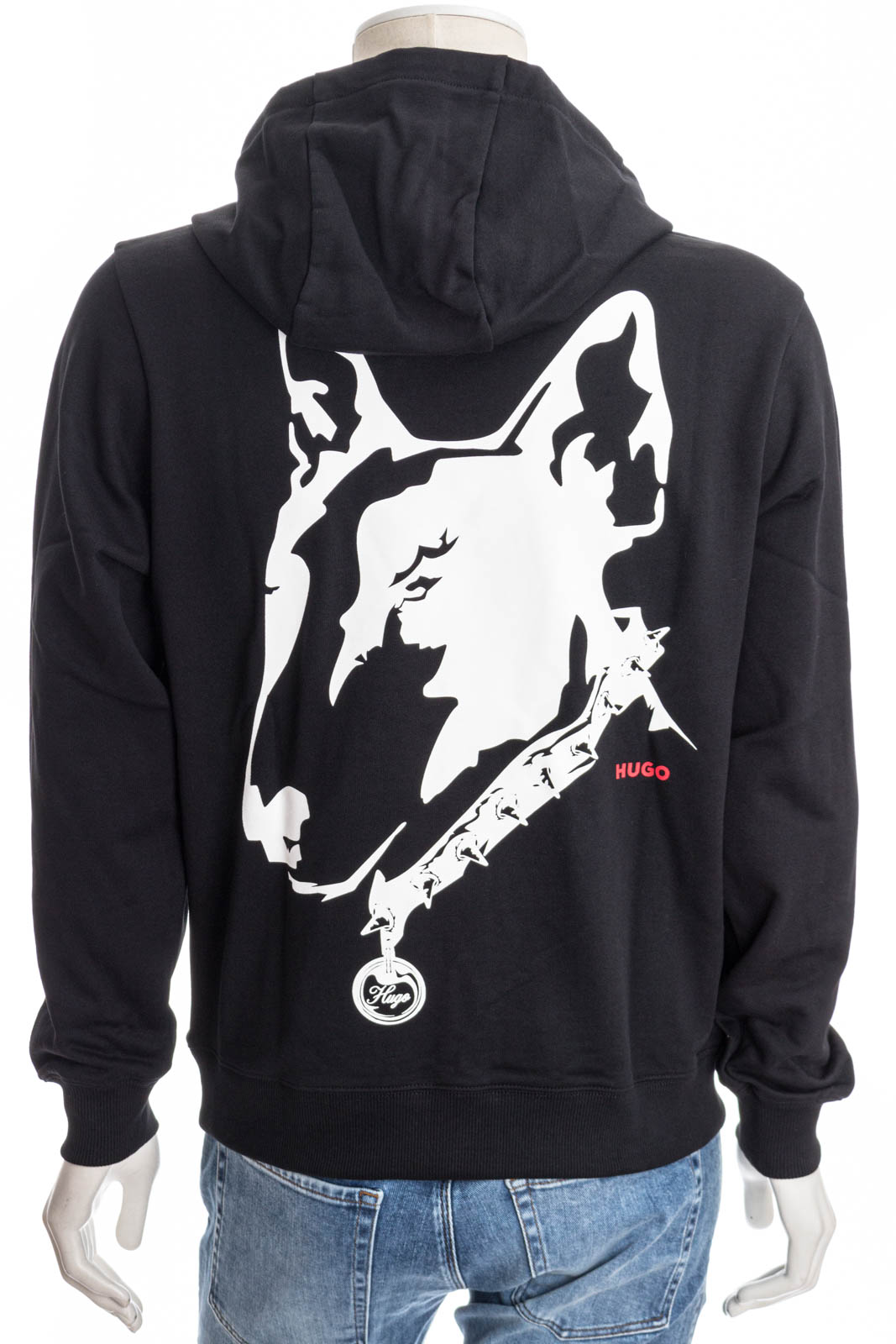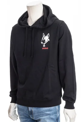 Progressiver HUGO Hoodie aus French Terry mit lockerer Passform und Hunde-Artwork auf Vorder- und RĂĽckseite.