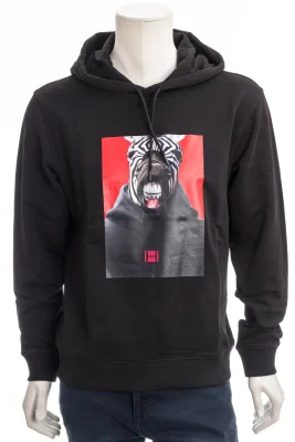 Locker geschnittenes HUGO Kapuzen-Sweatshirt aus French Terry mit kreativem Artwork und Logo vorn.