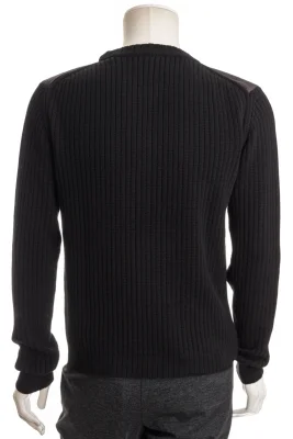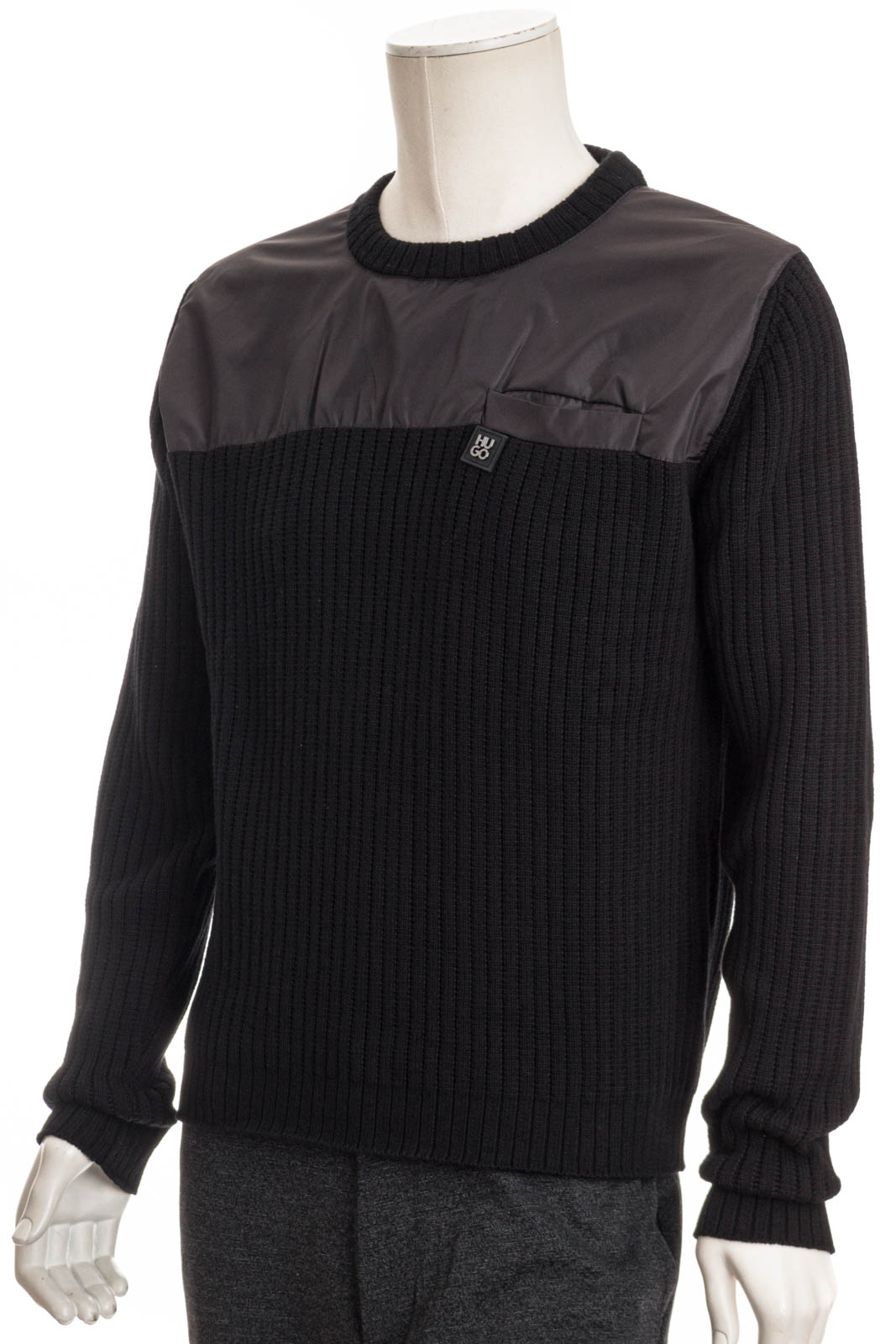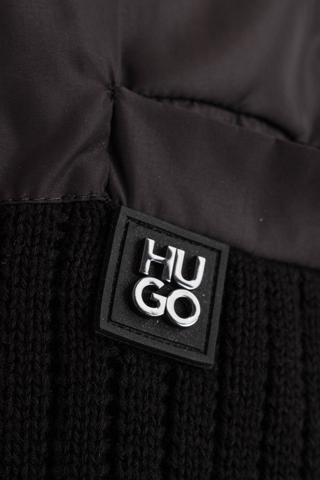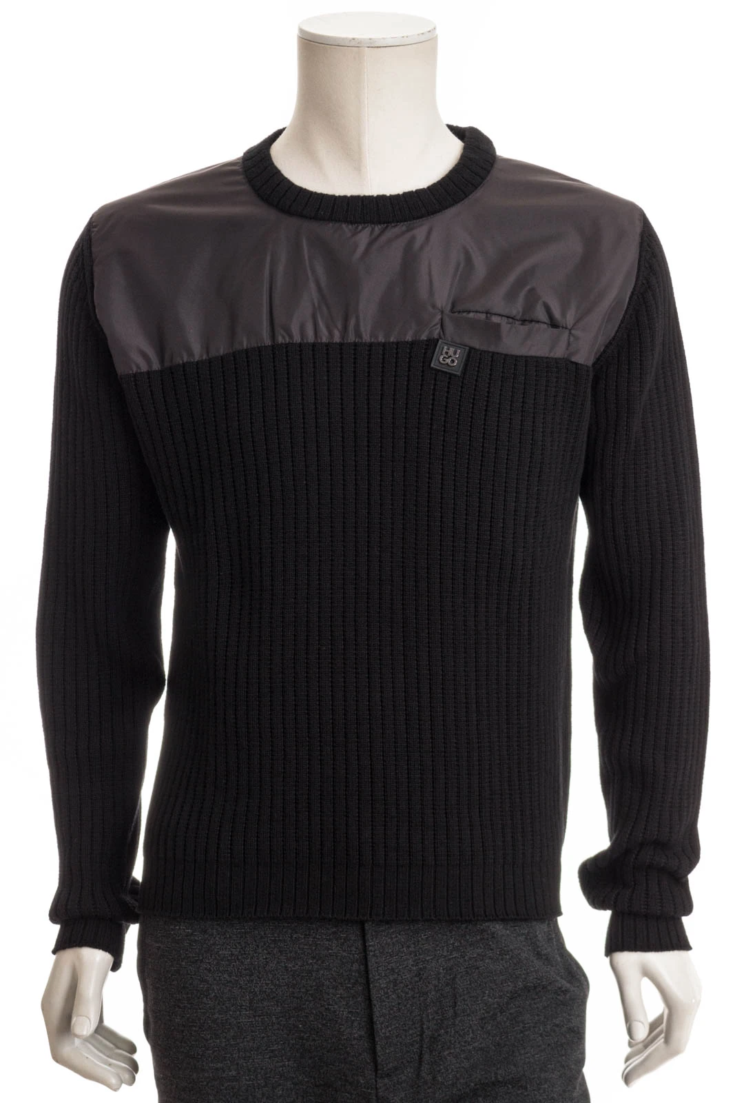 Grob gestrickter HUGO Pullover mit Stoffeinsatz im Brustbereich und HUGO-LABEL auf der Brust.