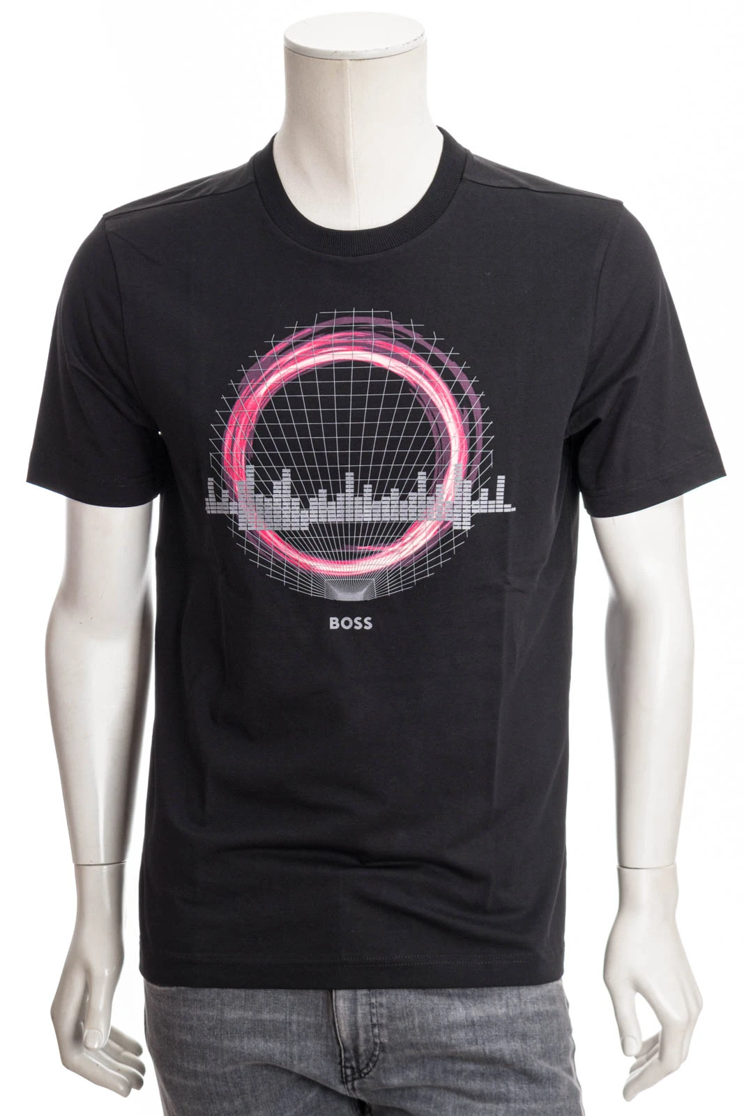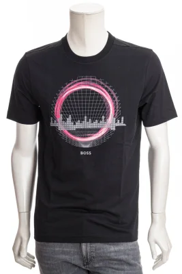 Gerade geschnittenes BOSS T-Shirt aus elastischer Baumwolle mit Techno-Artwork und Logo auf der Brust.
