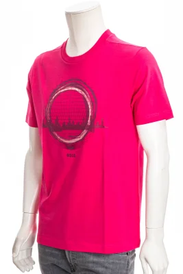 Gerade geschnittenes BOSS T-Shirt aus elastischer Baumwolle mit Techno-Artwork und Logo auf der Brust.