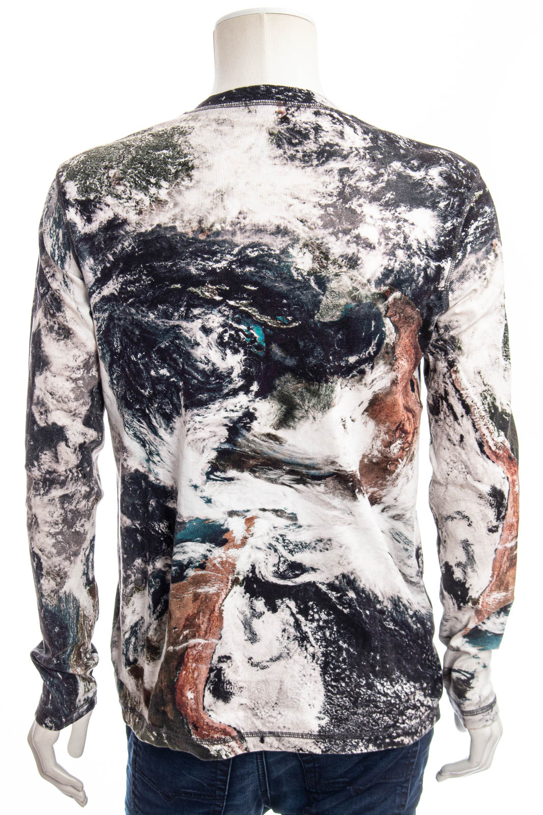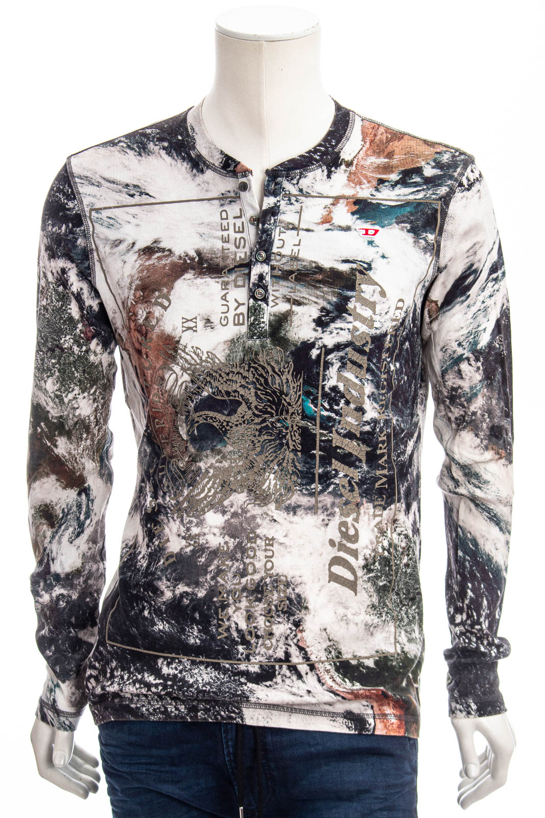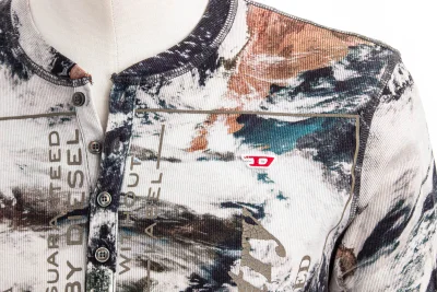 Regular-Fit-Henley-T-Shirt fĂĽr Herren aus gerippter Stretch-Baumwolle. Mit Planeten-Print, inspiriert von Satellitenaufnahmen der Erde. Stonewashed fĂĽr einen ausgebleichten Look und mit gerissenem Diesel Industry-Print sowie gesticktem D-Patch.