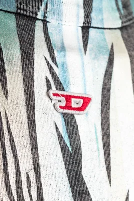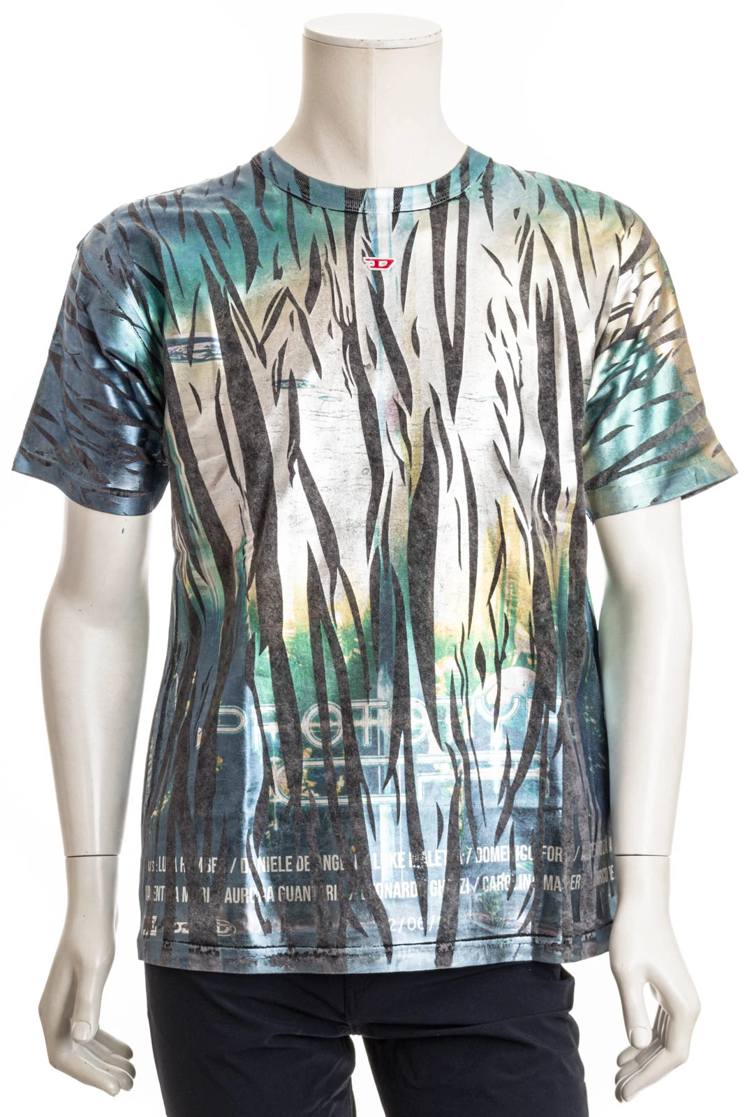Dieses T-Shirt im Show-Stil ist eine Ode an die experimentelle Diesel-Vision. Das T-Shirt wurde in einem beschichteten Finish ĂĽberdruckt und aufgerissen, was eine Bricolage von Grafiken und drapierten Effekten offenbart.