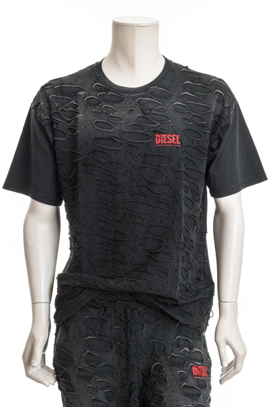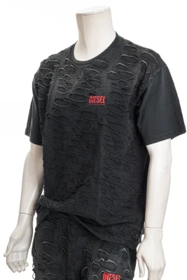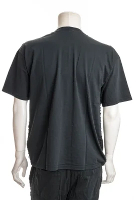 Ein lebendiges Plastisol-Print verleiht diesem Rundhals-T-Shirt für Herren einen auffälligen Touch. Das Stück zeichnet sich durch eine Jacquard-Schicht mit Löchern auf der Vorderseite aus. Zufällige aufgesprühte Bleich-Effekte tragen zum vielgetragenen Look bei, während die Rückseite glatt ist und eine leicht überschnittene Schulterpartie aufweist.