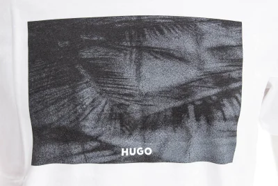 Gerade geschnittenes HUGO T-Shirt aus besonders softem Jersey mit abstrakter Palmen-Grafik und Logo-Detail.