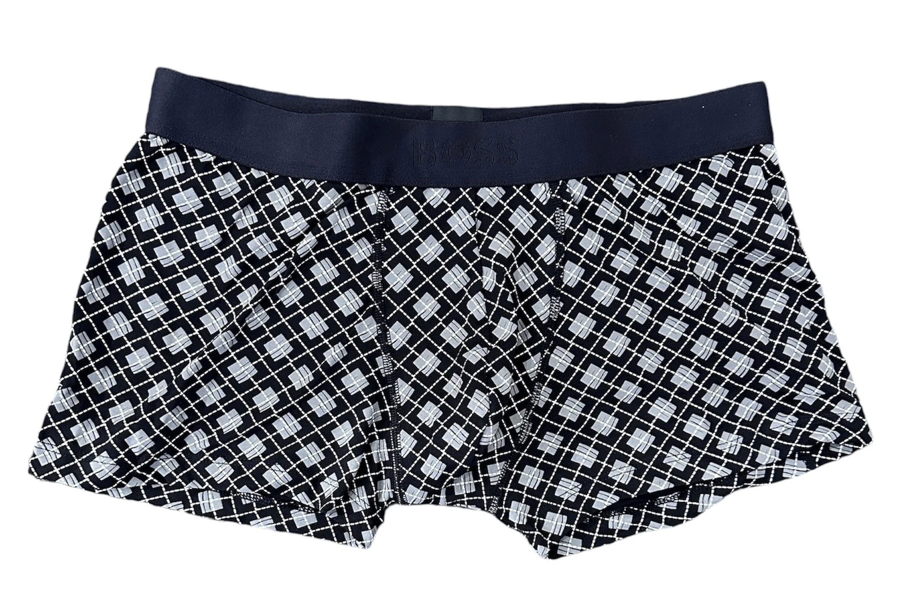 Charakteristische BOSS Boxershorts aus einem elastischen Gewebe mit mittlerer Bundhöhe, Logo-Bund und saisonalem Muster.