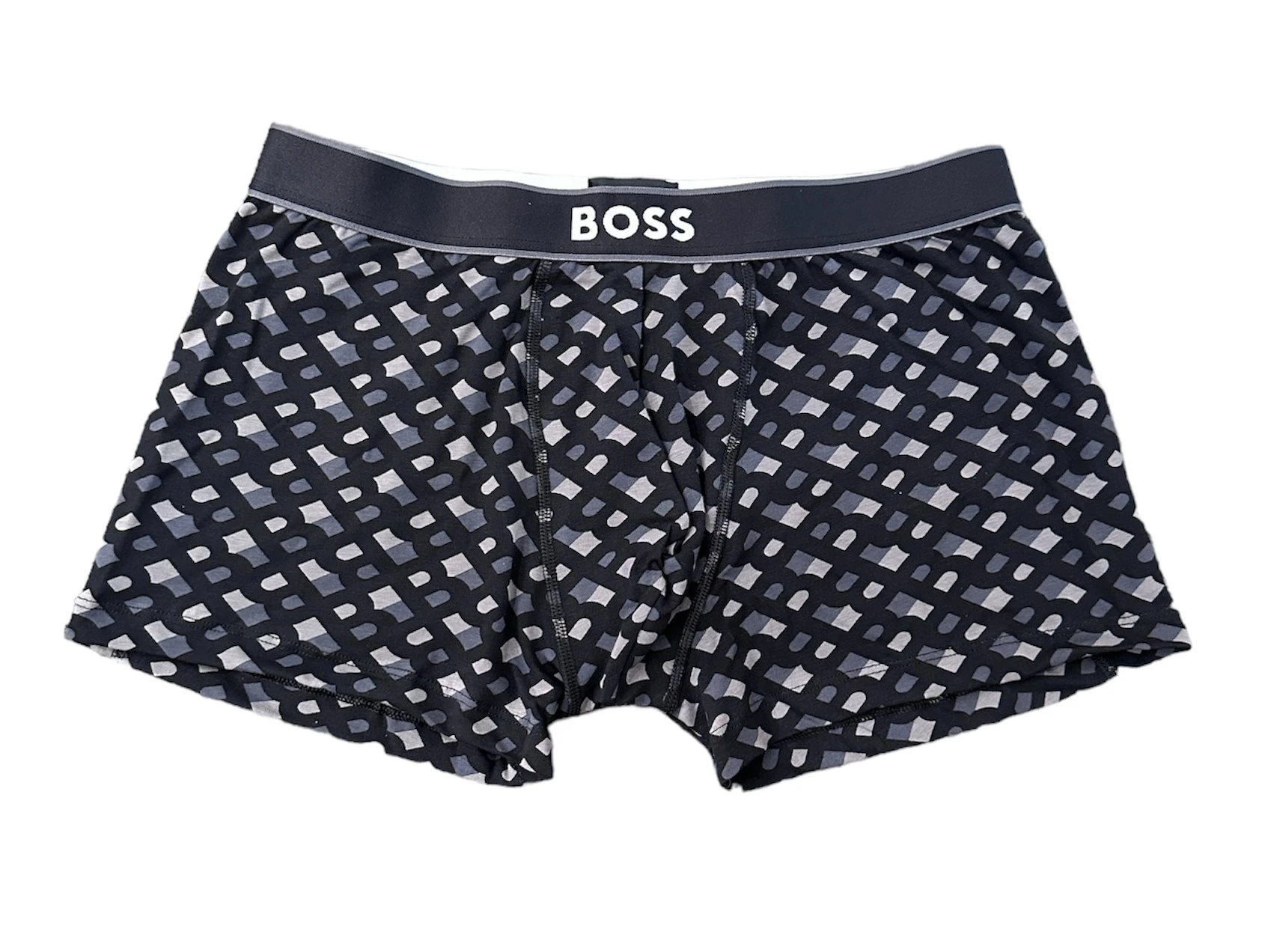 Charakteristische BOSS Boxershorts aus einem elastischen Gewebe mit mittlerer Bundhöhe, Logo-Bund und saisonalem Muster.