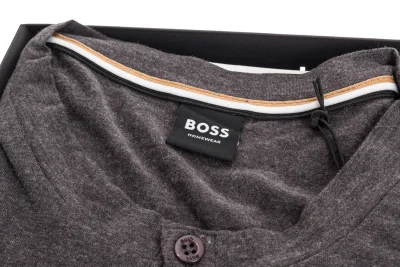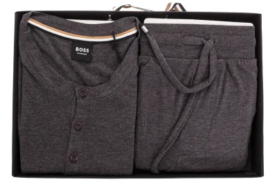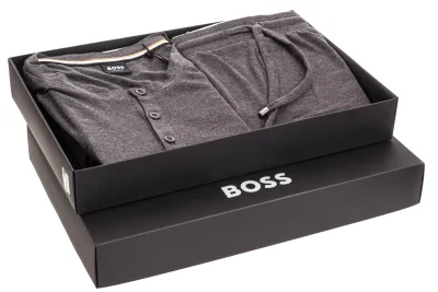 Gerade geschnittener BOSS Pyjama aus einem elastischen Gewebe mit Woll-Anteil. Das Set in der Geschenkbox beinhaltet ein Top mit Henley-Ausschnitt und Double-B-Monogrammen.
