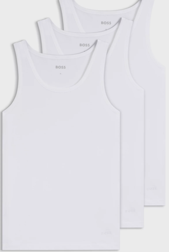 Drei BOSS Unterhemden. Die Herren-Tops aus natürlich atmungsaktiver Baumwolle besitzen eine dezente Logo-Stickerei am Saum. Dank der geraden Passform sind die Styles besonders bequem.